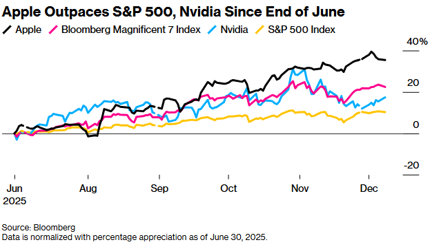 今年早些时候,苹果(AAPL.US)的股票曾遭受重创,原因是这家 iPhone 制造商因缺乏人工智能战略而 面临反复的批评。但随着 AI 交易面临越来越多的审视,这种犹豫已从一个弱点转变为一个优势——这 正体现在股市上。 在2025年上半年,苹果是"美股七巨头"中表现第二差的股票,截至6月底其股价暴跌了18%。但自那以 后,情况发生了逆转,苹果股价飙升了35%,而Meta平台和微软等人工智能宠儿的股价已陷入下跌,甚 至连英伟达的表现也相形见绌。同期,标普500指数上涨了10%,科技股权重较高的纳斯达克100指数上 涨了13%。 持有苹果股票的Needham Aggressive Growth Fund的基金经理约翰·巴尔表示:"当所有同行都朝着相反的 方向发展时,他们能保持头脑清醒并控制支出,这非常了不起。" 自6月底以来,苹果公司的表现优于标普500指数和英伟达 结果是,苹果目前的市值已达到 4.1 万亿美元,在标普 500 指数中的权重位居第二,超越了微软,并正 逼近英伟达。这一转变反映了市场对大型科技公司投入数千亿美元进行 AI 研发的质疑,以及苹果在技 术成熟后用于大规模使用时最终将受益的定位。 Gl ...