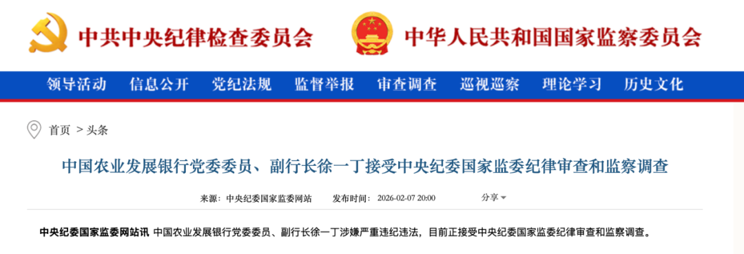 北京商报讯(记者 宋亦桐)2月7日,据中央纪委国家监委网站消息,中国农业发展银行党委委员、副 行长徐一丁涉嫌严重违纪违法,目前正接受中央纪委国家监委纪律审查和监察调查。 ...