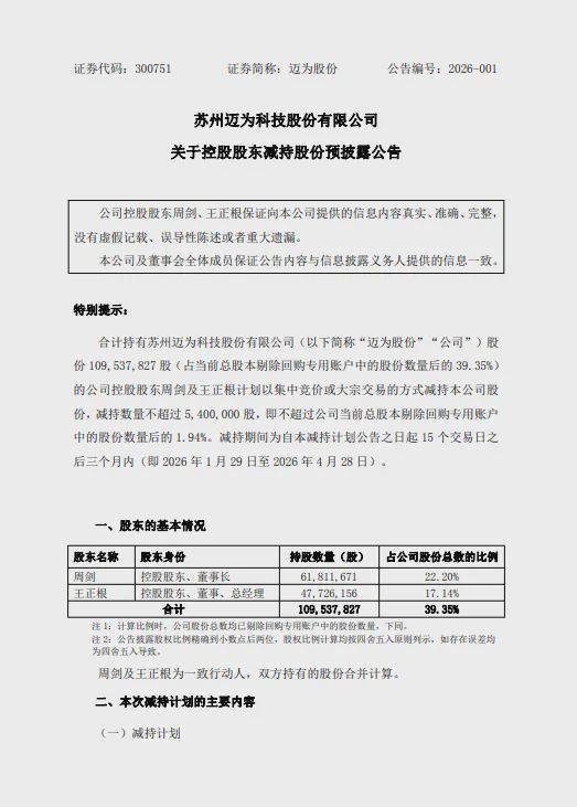 1月7日,迈为股份(300751)发布关于控股股东减持股份预披露公告称,合计持有公司股份109,537,827 股(占当前总股本剔除回购专用账户中的股份数量后的39.35%)的公司控股股东周剑及王正根计划以 集中竞价或大宗交易的方式减持本公司股份,减持数量不超过5,400,000股,即不超过公司当前总股本剔 除回购专用账户中的股份数量后的1.94%。减持期间为自本减持计划公告之日起15个交易日之后三个月 内(即2026年1月29日至2026年4月28日)。 公告显示,控股股东、董事长周剑持有61,811,671股,占公司总股本的22.20%;控股股东、总经理王正 根47,726,156股,占公司总股本的17.14%。周、王二人合计持有109,537,827股,占公司总股本的 39.35%。 因个人资金需求,周剑、王正根分别计划减持不超过270万股,各占公司总股本的0.97%,合计占公司 总股本的1.94%。 1月7日,迈为股份(300751)发布关于控股股东减持股份预披露公告称,合计持有公司股份109,537,827 股(占当前总股本剔除回购专用账户中的股份数量后的39.35%)的公司控股股东周剑及王正根计划 ...