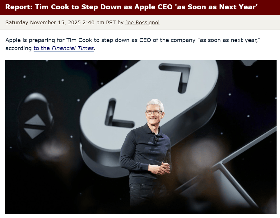 今天是 11 月 17 日 农历九月廿八 杭州今天大降温 早上出门的时候 给车子补胎压 都花了我 10 分钟 苹果CEO库克被曝或于明年卸任 ( 央视财经)综合多家外媒报道,美国苹果公司首席执行官蒂姆·库克有可能最早于明年卸任,苹果公司目前正在加紧物色继任者,现任公司硬件工程高 级副总裁特努斯,被普遍视为最有可能的继任者。截至目前,苹果公司尚未对此事作出回应。 现年65岁的库克自2011年起担任苹果公司CEO,至今已有14年时间。特努斯现年50岁,这与库克当年出任CEO时年龄相仿。 特努斯于2001年加入苹果产品设计团队,目前负责领导苹果全部硬件工程团队。有分析指出,特努斯的技术背景和擅长领域与苹果公司当前试图从侧重发 展生态链向偏重硬件技术转型的需求相契合。 :换 CEO 了,产品也会有大变化吧? 华为新品发布会官宣 下面是今天的其他大新闻 ( 新浪科技 )今日,华为官宣华为Mate 80系列 | Mate X7及全场景新品发布会,将于11月25日14:30分举行。 作为年度压轴高端旗舰,华为 Mate 80 系列的亮相将备受瞩目。市场关注的焦点在于,该机或将采用新一代麒麟芯片,性能层面带来显著提升;而上月 ...