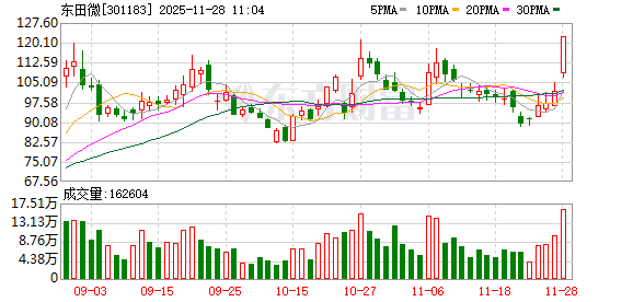 Core Viewpoint - Dongtian Micro's stock price reached a historical high, reflecting strong market performance and investor interest [2] Company Performance - Dongtian Micro's stock price increased by 20.00%, reaching 122.22 yuan, with a trading volume of 14.39 million shares and a transaction amount of 1.661 billion yuan [2] - The company's total market capitalization is now 9.778 billion yuan, with a circulating market value of 7.165 billion yuan [2] - The company reported a revenue of 637 million yuan for the first three quarters, representing a year-on-year growth of 53.91% [2] - The net profit for the same period was 80.03 million yuan, showing a year-on-year increase of 99.20% [2] - Basic earnings per share are reported at 1.0000 yuan, with a weighted average return on equity of 8.90% [2] Industry Overview - The electronic industry, to which Dongtian Micro belongs, has an overall increase of 0.55%, with 329 stocks rising and 4 stocks, including Dongtian Micro, hitting the daily limit [2] - Conversely, 149 stocks in the industry experienced declines, with notable drops from companies like Tengjing Technology and Zhihua Power, with declines of 5.43%, 5.25%, and 5.06% respectively [2] Financing Data - As of November 27, the margin trading balance for Dongtian Micro is 511 million yuan, with a financing balance of the same amount [2] - Over the past 10 days, the financing balance has increased by 69.0488 million yuan, reflecting a growth of 15.63% [2]