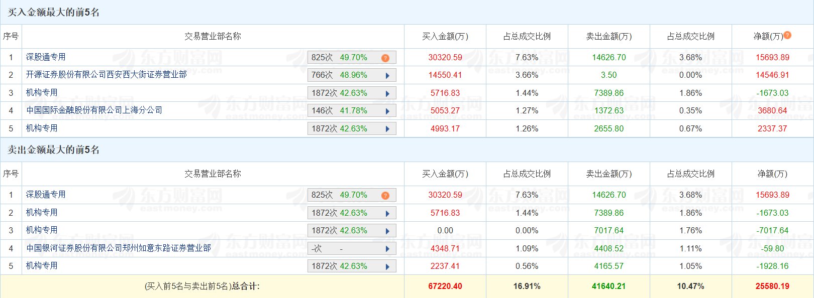 许继电气今日涨停,全天换手率12.32%,成交额39.76亿元,振幅7.78%。龙虎榜数据显示,机构净卖出 8281.45万元,深股通净买入1.57亿元,营业部席位合计净买入1.82亿元。 | 买/卖 | 会员营业部名称 | 买入金额(万元) | 卖出金额(万元) | | --- | --- | --- | --- | | 买一 | 深股通专用 | 30320.59 | 14626.70 | | 买二 | 开源证券股份有限公司西安西大街证券营业部 | 14550.41 | 3.50 | | 买三 | 机构专用 | 5716.83 | 7389.86 | | 买四 | 中国国际金融股份有限公司上海分公司 | 5053.27 | 1372.63 | | 买五 | 机构专用 | 4993.17 | 2655.80 | | 卖一 | 深股通专用 | 30320.59 | 14626.70 | | 卖二 | 机构专用 | 5716.83 | 7389.86 | | 卖三 | 机构专用 | 0.00 | 7017.64 | | 卖四 | 中国银河证券股份有限公司郑州如意东路证券营业部 | 4348.71 | 4408.5 ...