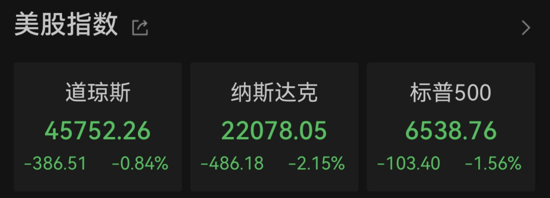 记者丨 黎雨桐 吴斌 编辑丨曾静娇 北京时间21日凌晨, 欧美股市走势分化,欧洲三大股指收盘全线上涨,美股则上演过山车式行情,集体高开而后一路下行,三大指数悉数收 跌。 截至美股收盘,道指跌0.84%报45752.26点,标普500指数跌1.56%报6538.76点,纳指跌2.15%报22078.05点。 | 道琼斯 | 纳斯达克 | 标普500 | | --- | --- | --- | | 45752.26 | 22078.05 | 6538.76 | | -386.51 -0.84% -486.18 -2.15% -103.40 -1.56% | | | | 中国金龙指数 | 纳指100期货 | 标普500期货 | | 7422.77 | 24073.75 | 6552.00 | | -250.44 -3.26% -648.00 -2.62% -109.50 -1.64% | | | 大型科技股集体下跌,万得美国科技七巨头指数下跌1.74%。个股方面,英伟达跌超3%,亚马逊、特斯拉跌逾2%, 微软、谷歌跌逾1%,苹果 跌近1%,脸书跌0.19%。 | 资料 成分 | 资讯 相关基金 | 月度收益 | | ...