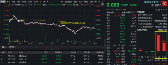 7月30日,大盘午后波动加剧,沪指冲高回落,创业板指全天弱势,收跌1.62%。国防军工板块短暂上 攻后单边回落,建设工业午后触及跌停,国防军工ETF(512810)一度下探2.44%,场内价格收跌1.29% 止步四连阳,振幅达3.3%。 值得关注的是,512810全天放量溢价,成交环比放量逾七成至1.33亿元,创近1个月新高,显示买盘资 金相对强势,或有大额资金逢跌介入。此前2日,512810连续获资金净申购超3500万元。 拉长时间来看,今年以来国防军工板块呈现震荡向上走势。尽管今日有所回调,但国防军工ETF (512810)盘初上扬时最高价达0.703元(前复权),已超越去年"924"行情高点(0.696元),创2022年 3月4日以来次高。 往后看,新时代国防军工行业具有更优的资产质量、更新的景气赛道、更大的 业务规模、更高的市场天花板,行业的估值体系或也将进行重塑,享受更新更高的溢价。 【投国防军工,选"512八一0"】 代码含"八一"的国防军工ETF(512810):兼顾传统主战力量+新域新质力量,覆盖"商业航天 + 低空经 济 + 大飞机 + 深海科技 + 军用AI + 可控核聚变"等诸多热门题材 ...