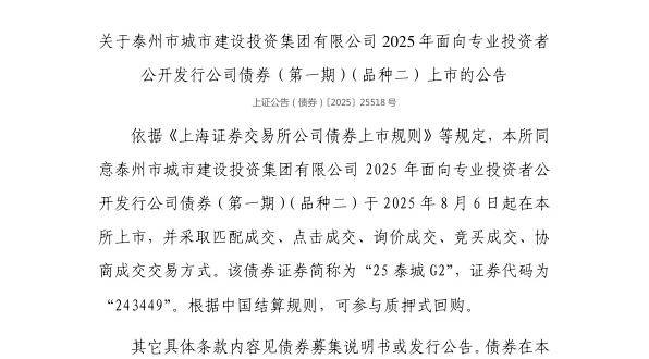 8月5日,上交所发布关于泰州市城市建设投资集团有限公司2025年面向专业投资者公开发行公司债券 (第一期)(品种二)上市的公告。 依据《上海证券交易所公司债券上市规则》等规定,上交所同意泰州市城市建设投资集团有限公司2025 年面向专业投资者公开发行公司债券(第一期)(品种二)于2025年8月6日起在上交所上市,并采取匹 配成交、点击成交、询价成交、竞买成交、协商成交交易方式。该债券证券简称为"25泰城G2",证券 代码为"243449"。根据中国结算规则,可参与质押式回购。 来源:金融界 ...