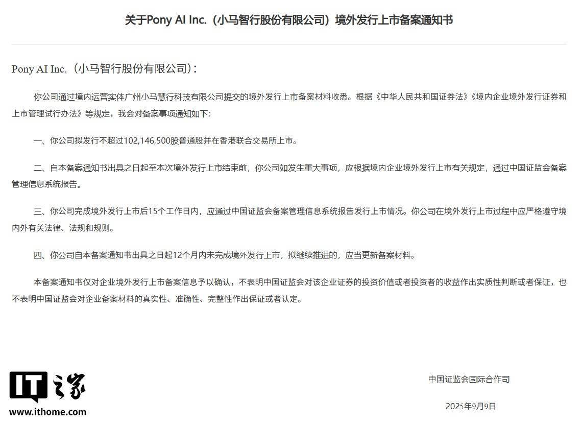 IT之家 10 月 14 日消息,中国证监会今日发布了《关于 Pony AI Inc.(小马智行股份有限公司)境外发行上市备案通知书》。公告显示,小马智行拟发行不 超过 102,146,500 股普通股并在香港联合交易所上市。 今年 3 月,业界有消息称小马智行及文远知行正在准备启动港股上市计划,但两家公司均予以否认。然而,小马智行及文远知行今日双双通过了证监会 IPO 备案。 小马智行于 2024 年 11 月 27 日在美国纳斯达克挂牌上市,募资 2.6 亿美元(IT之家注:现汇率约合 18.55 亿元人民币),同时向 4 家投资者定向增发 1.534 亿美元的 A 类普通股。 值得一提的是,小马智行美股昨日收涨 9.36%,目前市值达 77.73 亿美元(现汇率约合 554.6 亿元人民币)。 ...