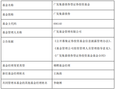 中国经济网北京1月6日讯今日,广发基金公告,广发集嘉债券增聘王海涛。 王海涛2003年5月至2005年7月在美国BusinessExcellenceInc.任投资经理;2005年7月至2009年10月在摩根 士丹利亚洲有限公司全球财富管理部任副总裁;2009年11月至2018年9月先后任兴全基金管理有限公司 基金管理部总监助理、基金经理,专户管理部副总监、投资经理,新三板部总监、投资经理。2018年9 月27日加入广发基金管理有限公司,现任广发基金管理有限公司副总经理、高级董事总经理、基金经理 兼任资产管理计划投资经理,兼任广发国际资产管理有限公司董事,曾任公司总经理助理、专户投资部 总经理。 广发集嘉债券A/C成立于2018年12月25日,截至2026年1月5日,其今年来收益率为0.12%、0.10%,成立 来收益率为52.96%、49.23%,累计净值为1.5023、1.4674。 | 基金名称 | 广发集嘉债券型证券投资基金 | | --- | --- | | 基金简称 | 广发集嘉债券 | | 基金主代码 | 006140 | | 基金管理人名称 | 广发基金管理有限公司 | | 公告依据 | 《公开 ...