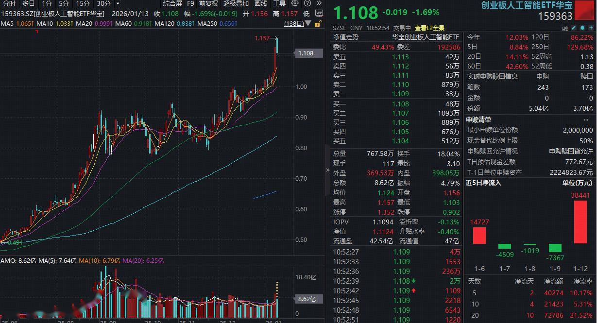 13日早盘,AI赛道呈现放量分歧,创业板人工智能新高后震荡回调。以GEO为代表的AI应用依然活跃,易点天下早盘一度20CM涨停,中文在线、万兴科技 大涨超10%;以光模块+IDC为核心的算力赛道则继续调整,金信诺领跌超9%,长芯博创、锐捷网络、天孚通信等下跌5%。 热门ETF方面,双线布局"AI应用+算力"的创业板人工智能ETF(159363)场内高开低走,上探新高后跌超1.5%,实时成交额超8亿元,资金继续大幅净申 购1.3亿份。 | 分时 多日 1分 5分 15分 30分 ▼ 综合屏 F9 前复权 超级叠加 画线 工具 (2 2 » | | | | | | | --- | --- | --- | --- | --- | --- | | 159363.SZ[创业板人工智能ETF华宝] 2026/01/13 收 1.108 幅 -1.69%(-0.019) 开 1.156 高 1.157 | WP 低 | | 19 08 -0.019 -1.69% | | | | MA5 1.065 MA10 1.0331 MA20 0.9997 MA60 0.9187 MA120 0.8381 MA250 0.6591 ( ...