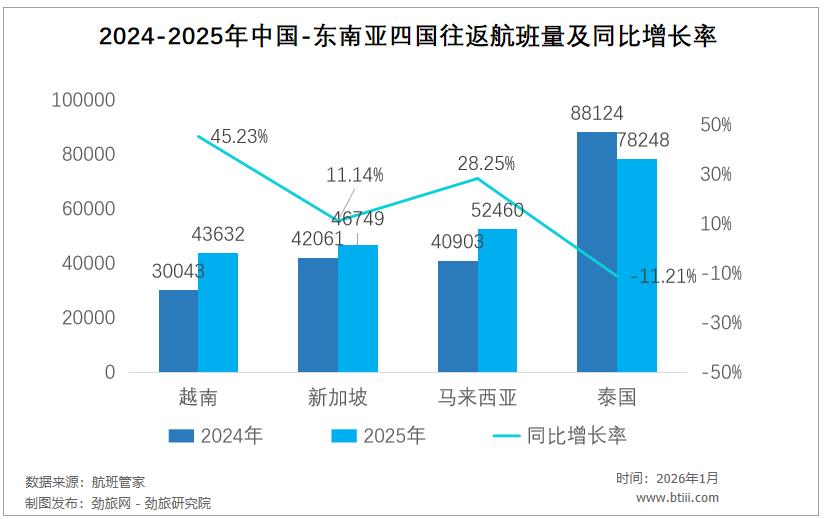 "越南干掉泰国成为东南亚接待中国游客最多国家"的新闻这两天在社交媒体上刷屏。 公开数据显示,2025年越南共计接待中国游客530万人次,同比暴涨41.3%。泰国共计接待中国游客447万人次,同比 暴跌33.6%。 越南和泰国这一上一下,不仅是名次的变化,更代表着东南亚出境游市场格局彻底重塑。 01 越南干掉泰国,劲旅君并不意外。 早在2025年一季度,越南就以160万人次中国游客的接待规模,悄然超越泰国的133万人次,并在随后三个季度一直保 持领先,最终在全年获得碾压式胜利。 很多人好奇,常年稳居头把交椅的泰国,怎么就在2025年急转直下,被越南干掉了呢? 事实上,这个中南半岛小霸王的异军突起,首先得益于一个重要因素:中越往返航班量爆发式增长。 众所周知,发展出境游的一大关键要素就是"航班量"。纵观2025年中国往返东南亚四个主要国家的航班量变化,越南 简直是一飞冲天。 来自航班管家数据显示,过往两年中国与泰国、马来西亚、新加坡和越南的航班量对比来看,越南并不占优势。尤其 是在2024年,中越之间全年往返航班量仅有3万班次,仅为同期中泰往返航班量的34%。 然而2025年中越往返航班量却直线上升,从3万班次猛 ...