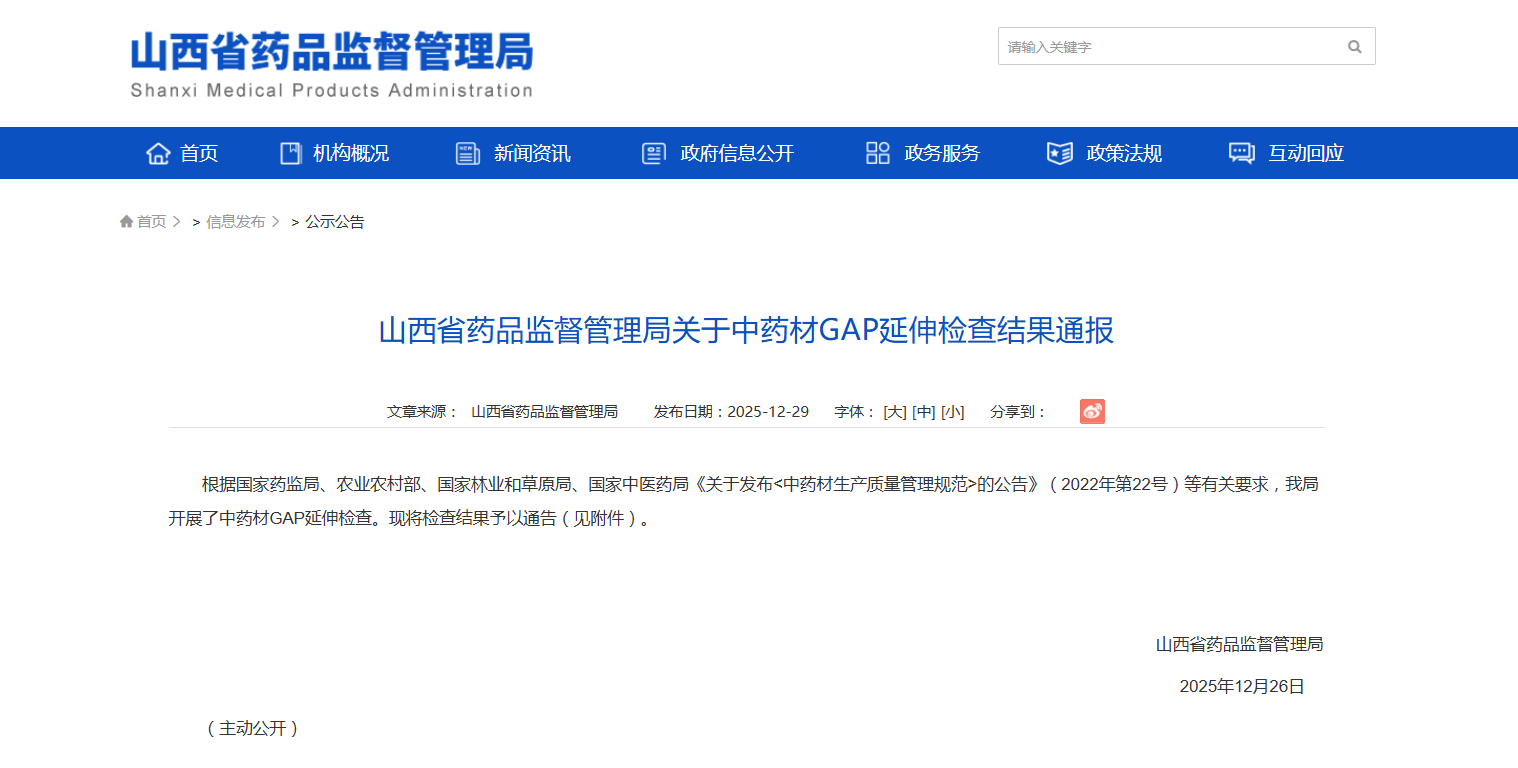山西省药品监督管理局关于中药材GAP延伸检查结果通报