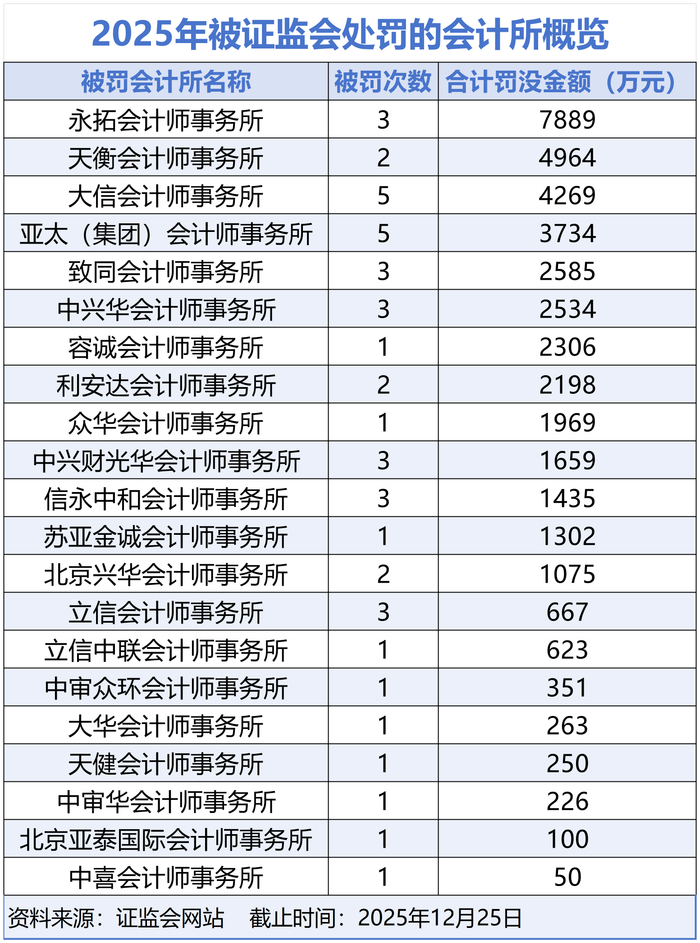 中经记者 孙汝祥 夏欣 北京报道 | 2025年被证监会处罚的会计所概览 | | | | --- | --- | --- | | 被罚会计所名称 | | 被罚次数 合计罚没金额(万元) | | 永拓会计师事务所 | 3 | 7889 | | 天衡会计师事务所 | 2 | 4964 | | 大信会计师事务所 | 5 | 4269 | | 亚太(集团)会计师事务所 | 5 | 3734 | | 致同会计师事务所 | 3 | 2585 | | 中兴华会计师事务所 | 3 | 2534 | | 容诚会计师事务所 | 1 | 2306 | | 利安达会计师事务所 | 2 | 2198 | | 众华会计师事务所 | 1 | 1969 | | 中兴财光华会计师事务所 | 3 | 1659 | | 信永中和会计师事务所 | 3 | 1435 | | 苏亚金诚会计师事务所 | 1 | 1302 | | 北京兴华会计师事务所 | 2 | 1075 | | 立信会计师事务所 | 3 | 667 | | 立信中联会计师事务所 | 1 | 623 | | 中审众环会计师事务所 | 1 | 351 | | 大华会计师事务所 | 1 | ...