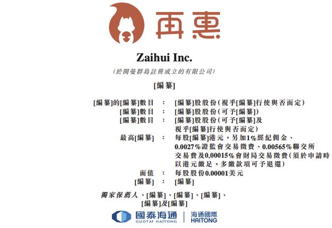 来源:智通财经 据港交所文件, 2月13日,Zaihui Inc.向港交所提交上市申请书,独家保荐人为国泰海通。该公司为餐 饮线上运营与营销解决方案提供商。 ...