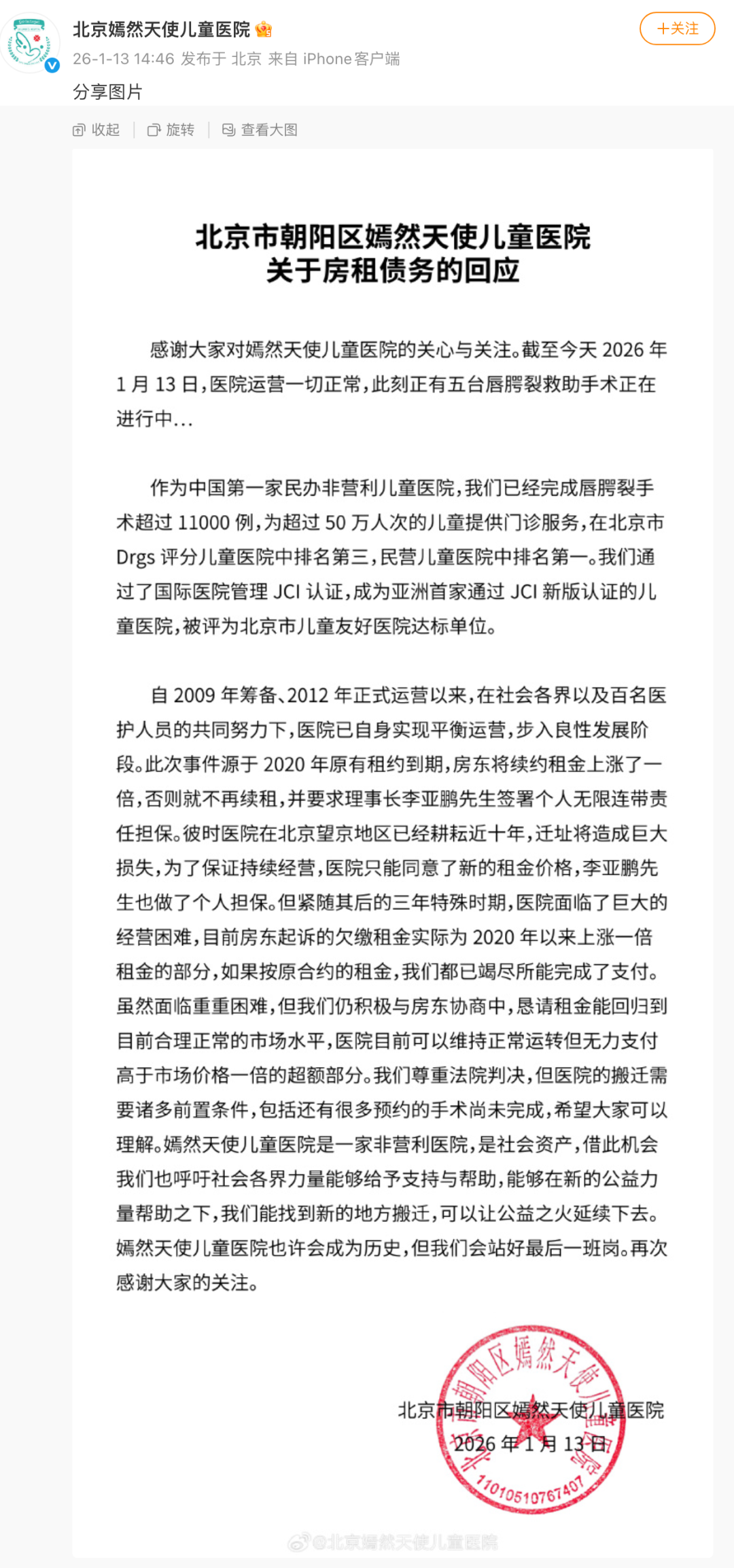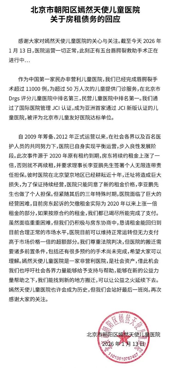 近日,多家媒体报道称,北京嫣然天使儿童医院(下称嫣然医院)从2022年起就拖欠房东的租金,尽管法院已下达判决书,且房东强制执行申请也已提 交,但医院始终不付租金、也不退还房屋。 1月13日,嫣然医院和李亚鹏均对此作出回应。 医院:恳请租金回到合理正常市场水平 李亚鹏:会站好最后一班岗 1月13日,北京嫣然天使儿童医院发布关于房屋债务的回应。原文如下: 北京市朝阳区嫣然天使儿童医院 关于房租债务的回应 感谢大家对嫣然天使儿童医院的关心与关注。截至今天 2026年 1月13日,医院运营一切正常,此刻正有五台唇腭裂救助手术正在 进行中 ... 作为中国第一家民办非营利儿童医院,我们已经完成唇胖裂手 术超过 11000 例,为超过 50 万人次的儿童提供门诊服务,在北京市 Drgs 评分儿童医院中排名第三,民营儿童医院中排名第一。我们通 过了国际医院管理 JCI 认证,成为亚洲首家通过 JCI 新版认证的儿 童医院,被评为北京市儿童友好医院达标单位。 自 2009年筹备、2012年正式运营以来,在社会各界以及百名医 护人员的共同努力下,医院已自身实现平衡运营,步入良性发展阶 段。此次事件源于 2020年原有租约到期, ...