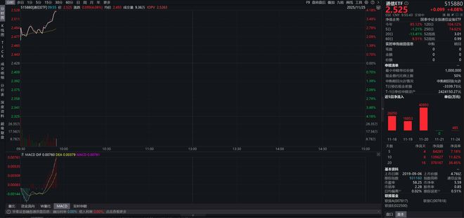 11月25日早盘,AI赛道王者归来,算力硬件、AI应用全线活跃,创业板人工智能涨超3%领跑同类!截 至发稿,长芯博创、易点天下领涨超7%,锐捷网络、协创数据、光库科技、联特科技、新易盛、中际 旭创等多股涨超3%。 热门ETF方面,双线布局"算力+AI应用"的创业板人工智能ETF(159363)场内涨超3%,领跑全市场AI 主题类ETF,实时成交额超1.5亿元,环比放量,一举收复5日、10日均线。 | | | 分时 多日 1分 5分 15分 30分 · | | | | | | F9 盘前盘后 窗加 九泉 图线 工具 @ 2 > | | | | 创业板人工智能ETF华室 | | 159363 | | --- | --- | --- | --- | --- | --- | --- | --- | --- | --- | --- | --- | --- | --- | --- | | 0.840 | | | | | 159363[创业板人工智能ETF华宜] 09:44 价 0.836 涨跌 0.024(2.96%) 均价 0.834 股... | | | | | | 0.336 | | | +0.024 +2.96% ...