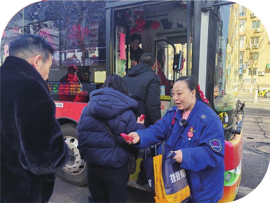 发车前,马丽莎在给乘客发春节小礼物。 本报记者 金国建 摄 二月十九日正月初三 沈阳258路公交车 互相拜年 车厢里传来新春问候 "马师傅,过年好!""过年好,李阿姨,今天出来挺早呀!"上午10时10分,马丽莎的公交车从洮昌小区始发,乘客一上车,就像见到了老 熟人一样互致新春问候。 虽然是春节期间,但乘客却不少,车辆行驶四五站车厢就满了。在大北边门站,一位年长者从前门上车,左手用力拉着扶手,右手拉着手 拉车,马丽莎笑着对长者说:"大爷,过年好,站稳喽。"待老人找到座位坐好,马丽莎看了一眼后视镜,才缓缓启动车辆。 "这姑娘开车稳当,心也细。"常坐258路的张大爷说,"我七十多岁了,每次上车她都等我坐稳了才开车,坐她的车,心里踏实又暖和。" 马丽莎常说:"这些乘客跟我父母年纪差不多,把他们当自家人看待,自然就知道该怎么服务了。"简单的话语背后,是日复一日的暖心服 务。冬天,她会提前热好车打开暖风,乘客上来就感到暖乎;夏天,她会在终点站提前打开车门,让乘客到车里享受空调的凉快。 发红包送礼物 乘客惊喜"回礼" 新春佳节的旋律是团圆喜庆,马丽莎连续三年在春节期间为乘客发"红包"。"这辆公交车就是我的家,乘客就是我家的 ...