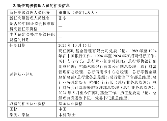 公开信息显示,张东深耕金融行业超过36年,在"招商系"工作就长达31年。多年来,张东在财富管理领 域积累深厚,全程参与及推动招行财富管理体系发展。 2024年5月起,张东担任博时基金总经理。其间,张东带领博时基金积极践行公募基金实现高质量发 展,坚持"稳"字当头,增强内生增长动力,全面提升核心竞争力,持续为持有人的财富增长贡献力量。 同时,公司在复杂的市场环境中实现稳中有进,进中向优,市场地位得到进一步巩固。 10月15日晚间,博时基金发布高级管理人员变更公告,经博时基金管理有限公司第九届董事会2025年第 五次临时会议审议并通过,江向阳因工作安排辞任公司董事长,由博时基金党委书记、总经理张东正式 接任公司董事长暨法定代表人。 | 新任高级管理人员职务 | 董事长(法定代表人) | | --- | --- | | 新任高级管理人员姓名 | 张东 | | 是否经中国证监会核准取 | | | 得高管任职资格 | | | 中国证监会核准高管任职 | | | 资格的目期 | | | 任职目期 | 2025年10月15日 现任博时基金管理有限公司党委书记。1989年至1994 | | | 年在中国银行工作。1994年至 ...