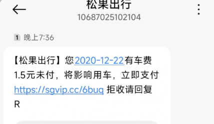 扬子晚报网1月6日讯(记者 郭一鹏) 近日,有江苏网友在社交平台上发帖称,莫名其妙收到一个"松果出行"的短信,称其 2021年6月24日有车费21.4元未支付,提醒立即支付否则会影响用车。该网友觉得像诈骗信息,因为在她的印象中未使用 过"松果出行"。 针对网友们的疑问,1月6日,扬子晚报/紫牛新闻记者致电了"松果出行"。客服人员表示,这段时间确实对有账户欠费的用 户发送了信息。"有用户对此存疑,说时间比较久了,记不清楚当时有没有付费,对于这一块,我们可以协助查询,一般在 支付宝或微信那边有付款记录,核对下订单时间就知道了。"客服人员表示。 至于为何隔了这么久才通知用户有欠费,该客服人员解释说,原则上如果有用户没有支付的话,会在下一次用车之前直接 弹出对话框显示欠费。"可有的用户像出去旅游,只用了一次我们家车,后续的话一直都没再用过,系统长时间监测到了, 就会统一发送这样一个短信。"当记者问及如果用户对此不认可,不愿补交费用会怎么处理时,该客服人表示,对于这部分 用户可以帮忙向公司申请酌情处理。"当然,大部分用户的话,我们这边信息一提醒,是会想起来的。"该客服人员同时表 示,因为确实是金额不多,这个欠费不会对用 ...