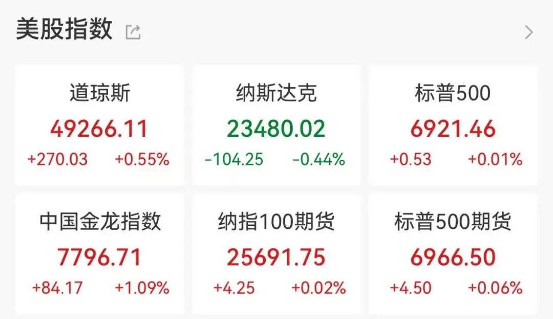 记者丨曾静娇 编辑丨刘雪莹 美东时间周四,美股三大指数集体低开,收盘涨跌不一,道指涨0.55%,标普500指数涨0.01%,纳指跌 0.44%。存储概念普跌,能源股强势,中概股多数上涨。国际油价大涨,黄金白银夜盘走势分化。 | 道琼斯 | 纳斯达克 | 标普500 | | --- | --- | --- | | 49266.11 | 23480.02 | 6921.46 | | +270.03 +0.55% | -104.25 -0.44% | +0.53 +0.01% | | 中国金龙指数 | 纳指100期货 | 标普500期货 | | 7796.71 | 25712.00 | 6971.25 | | +84.17 +1.09% | -126.75 -0.49% | +8.00 +0.11% | 具体来看,大型科技股多数下跌,英特尔跌超3%,英伟达跌逾2%,微软跌超1%,苹果小幅下跌;谷 歌、亚马逊、特斯拉涨超1%。 存储概念普跌,闪迪跌超5%,希捷科技跌超7%,西部数据跌超6%,美光科技跌超3%。 | 名称 | 现价 | 涨跌 | 涨跌幅 | 年初至今 | | --- | --- | --- | --- ...