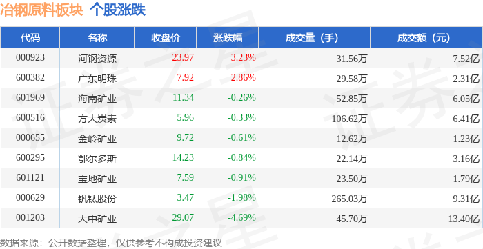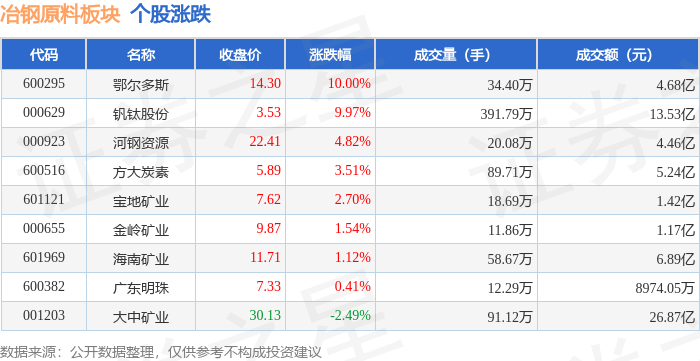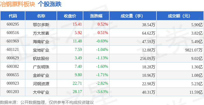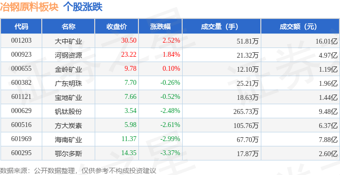 | 代码 | 名称 | 收盘价 | 涨跌幅 | 成交量(手) | 成交额(元) | | --- | --- | --- | --- | --- | --- | | 000629 | 钢钛股份 | 3.58 | 2.58% | 316.96万 | 11.33 Z | | 600295 | 鄂尔多斯 | 15.80 | 2.53% | 31.96万 | 4.87 Z | | 600516 | 方大炭素 | 6.04 | 2.03% | 115.82万 | 6.94亿 | | 601121 | 宝地矿业 | 7.73 | 1.84% | - 15.10万 | 1.16亿 | | 600382 | 广东明珠 | 7.52 | 1.62% | 17.18万 | 1.29亿 | | 000655 | 金岭矿业 | 9.88 | 0.82% | 10.90万 | 1.07亿 | | 000923 | 河钢资源 | 22.86 | 0.66% | 18.85万 | 4.30亿 | | 601969 | 三是越便 | 11.53 | 0.44% | 40.84万 | 4.70亿 | | 001203 | 大中矿业 | 27.9 ...