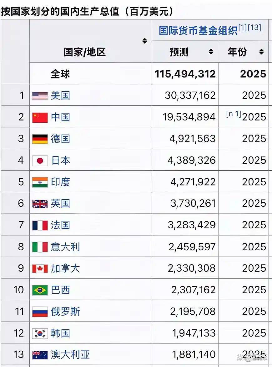 2025年全球GDP10强国家预测:中国约20万亿,英国远超法国,俄罗斯出局!