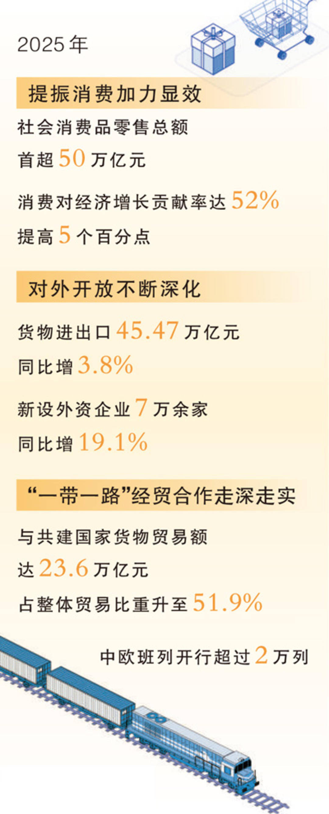 2025年 消费对经济增长贡献率达52% 提高5个百分点 对外开放不断深化 货物进出口 45.47 万亿元 同比增3.8% 新设外资企业 7 万余家 同比增19.1% e 带一路"经贸合作走深走实 达 23.6 万亿元 与共建国家货物贸易额 提振消费加力显效 社会消费品零售总额 首超 50 万亿元 提升文化娱乐、旅游休闲、餐饮住宿、体育赛事、医疗健康等领域供给水平 鄢东介绍,2025年,商务部坚持惠民生和促消费紧密结合,以"政策+活动"双轮驱动,打造"购在中 国"品牌,释放消费活力,全年社会消费品零售总额首次突破50万亿元,达50.1万亿元,同比增长 3.7%,消费对经济增长的贡献率提高5个百分点至52%。 在商品消费方面,扩围提质实施消费品以旧换新,汽车、家电、手机等相关产品销售额2.61万亿元,惠 及3.66亿人次。在服务消费方面,开展服务消费提质惠民行动,全年服务零售额同比增长5.5%,文体休 闲、旅游咨询租赁、交通出行等服务零售额保持两位数增长。在创新消费场景方面,开展国际化消费环 境建设试点,优化离境退税政策,离境退税商品销售额增长近一倍。240小时过境免签政策实施一年 来,免签入境外国人增长近三成 ...
