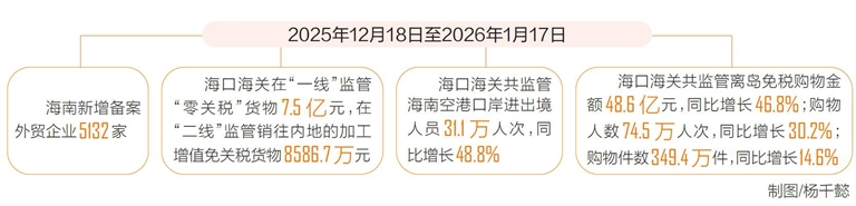 在"一线",海南自贸港"零关税"等政策高效实施,借助径予放行便利化通关模式,海南口岸进口货物迎来通 关效率与成本双优化,有力支撑自贸港产业升级。1月9日,一批进口的3万吨矿产品运抵海南洋浦港,该批矿 产以"'零关税'+径予放行"模式入境,全程通关流程简化、时效提升。该批货物进口企业相关负责人表示,径 予放行让原料进口通关更高效,"零关税"政策大幅降低企业采购成本,双重利好让企业能更快推进产能释 放。 海南自贸港封关首月,进口"零关税"货值达7.5亿元 离岛免税购物金额超48亿元 | | | 2025年12月18日至2026年1月17日 | | | --- | --- | --- | --- | | | 海口海关在"一线"监管 | 海口海关共监管 | 海口海关共监管离岛免税购物金 | | 海南新增备案 | "零关税"货物75亿元,在 | 海南空港口岸进出境 | 额48.6亿元,同比增长46.8%;购物 | | 外贸企业5132家 | "二线"监管销往内地的加工 | 人员31万人次,同 | 人数74.5万人次,同比增长30.2%; | | | 增值免关税货物 8586.7万元 | 比增长48.8% | 购物件数3 ...