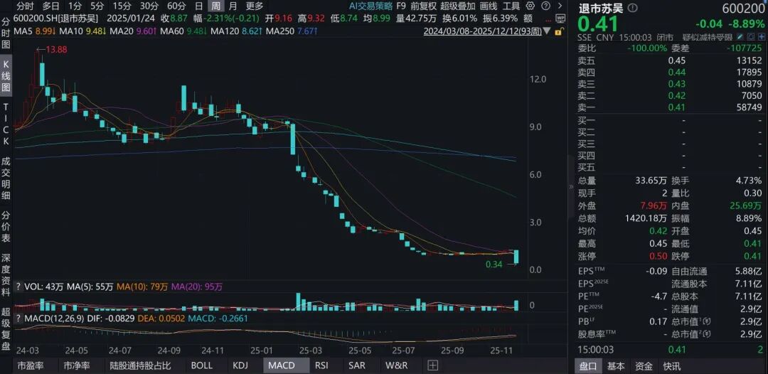 时隔半年,再次谈起钱氏姐弟财务造假的细节,退市苏吴(以下统称江苏吴中)的时任高管们变得沉默寡言。 因连续多年财务造假被勒令退市的江苏吴中股票于2025年12月9日进入退市整理期。截至发稿,留给中小股东决定去留的时间仅剩11个交易日。从12月9日 开盘到现在,江苏吴中股价累计下跌66.94%。 | 分时 多日 1分 5分 15分 30分 60分 日 周 月 更多 | AI交易策略 F9 前复权 超级叠加 画线 工具 @ ② > | 退市苏吴 1 | 600200 | △ 600200.SHi退市苏曼] 2025/01/24 收8.87 幅-2.31%(-0.21) 开9.16 高9.32 低8.74 均8.99 量42.75万 换6.01% 振6.39% 额 | WP | 0.41 | -0.04 -8.89% | | | | | | | | | | | | --- | --- | --- | --- | --- | --- | --- | --- | --- | --- | --- | --- | --- | --- | --- | --- | --- | --- | | 2024/03/08-2025/12 ...