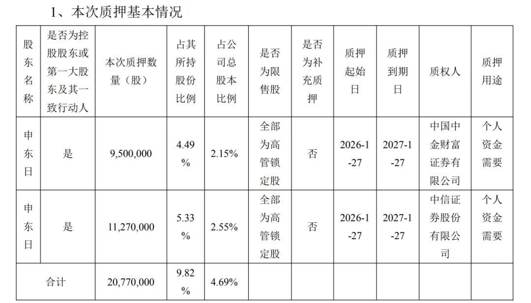 朗姿股份的老板又质押了公司股票。 近日,朗姿股份公告称,因个人资金需求,公司控股股东、实际控制人申东日于近期质押了其所持有的2077万股公司股份。 这些股份皆为高管锁定股,质押起始日为2026年1月27日,为期一年。其中,950万股被质押给了中国中金财富证券,另外1127万股则被质押给了中信证 券。 | 股 | 是否为控 | | 占其 | 占公 | | 是否 | | | | | | --- | --- | --- | --- | --- | --- | --- | --- | --- | --- | --- | | 东 | 股股东或 | 本次质押数 | 所持 | 司总 | 是否 | 为补 | 质押 | 质押 | | 质押 | | 名 | 第一大股 | 量(股) | 股份 | 股本 | 为限 | 充质 | 起始 | 到期 | 质权人 | 用途 | | | 东及其一 | | | | 售股 | | 日 | 日 | | | | 称 | | | 比例 | 比例 | | 押 | | | | | | | 致行动人 | | | | | | | | | | | 中 | | | 4.49 | | 全部 为高 | | 2026-1 ...