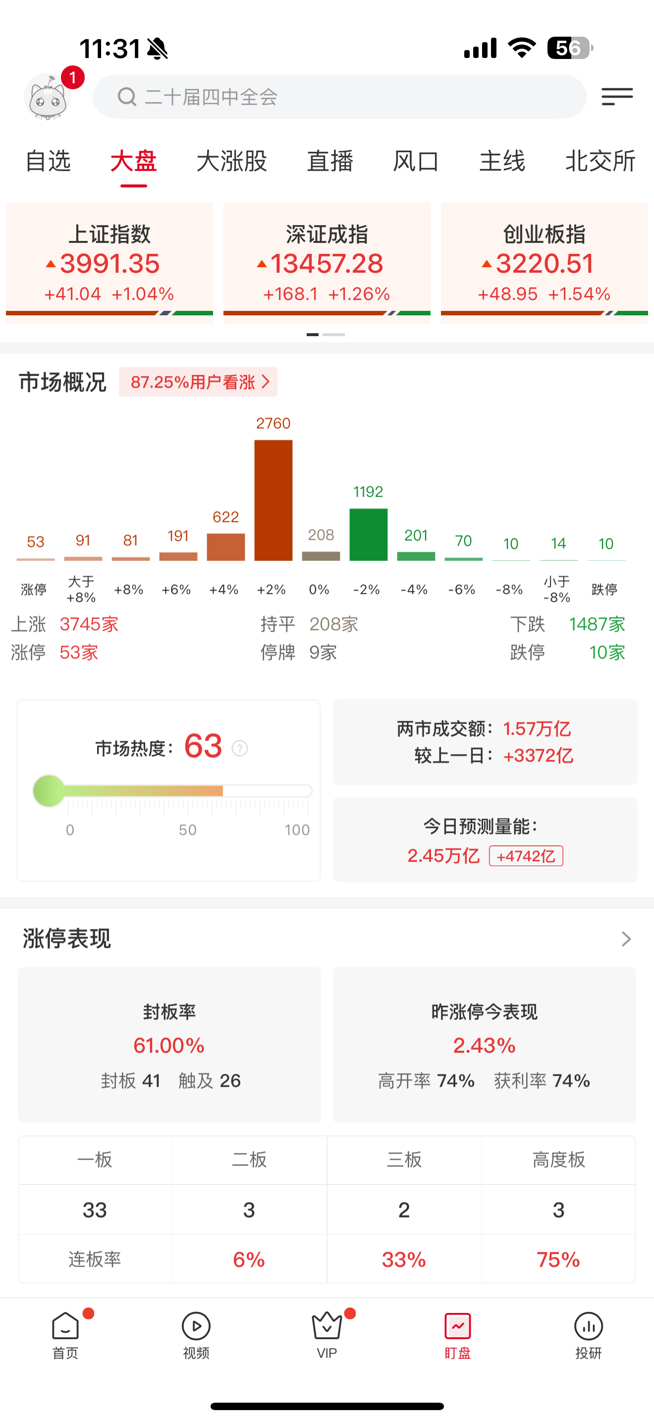 Market Overview - The market experienced a strong upward trend, with the Shanghai Composite Index rising over 1% and reaching a ten-year high, approaching 4000 points [1] - The total trading volume in the Shanghai and Shenzhen markets was 2.34 trillion, an increase of 365.9 billion compared to the previous trading day [1] Sector Performance - Leading sectors included storage chips, CPO, and controllable nuclear fusion, while gaming and wind power equipment sectors saw declines [2] - Notable stocks in the storage chip sector, such as Demingli and Jiangbolong, reached new highs, with several stocks in the computing hardware sector also performing strongly [2] Stock Movement - A total of 3361 stocks rose, while 217 remained unchanged, and 63 stocks hit the daily limit up [5] - The market heat index was recorded at 56, indicating a moderate level of market activity [5] Limit-Up Performance - The limit-up performance showed a sealing rate of 63%, with a high opening rate of 74% and a profit rate of 2.73% [6] - The number of stocks hitting limit-up included 38 on the first board, 6 on the second, and 3 on the third [6]