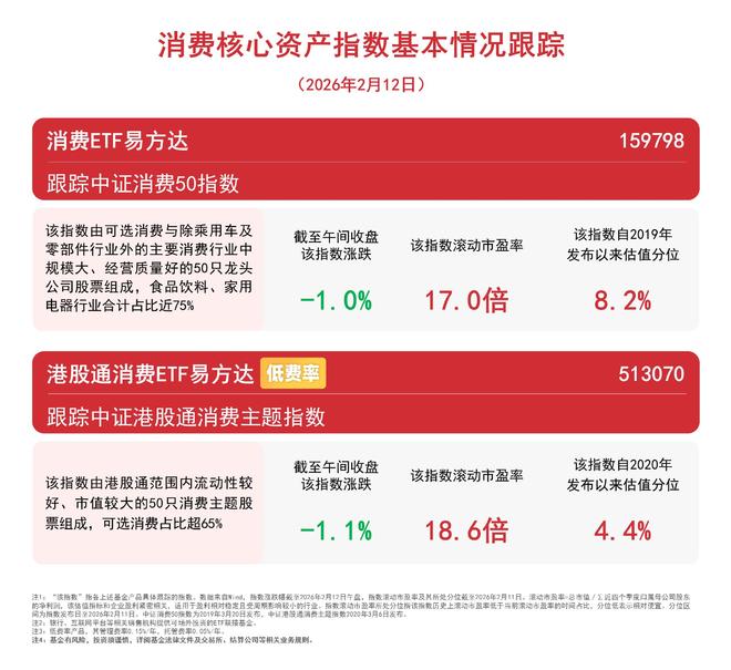 Group 1 - The core viewpoint of the article highlights the recent performance of the China Securities Consumption Index and the Hong Kong Stock Connect Consumption Theme Index, with increases of 3.2% and 4.1% respectively, indicating a positive trend in consumer stocks [1][3] - The E Fund Consumption ETF (513070) attracted 260 million yuan in the past week, reflecting strong investor interest in consumption-related ETFs [1][3] - The report from Galaxy Securities suggests that the technology sector remains a long-term investment focus, driven by multiple favorable factors such as price increases in the supply chain, domestic production trends, and accelerated AI applications [1][3] Group 2 - The rolling price-to-earnings (P/E) ratio for the China Securities Consumption 50 Index is 17.3 times, while the Hong Kong Stock Connect Consumption Theme Index has a rolling P/E ratio of 18.2 times, indicating a relatively low valuation for the consumption sector [3][4] - The consumption sector is expected to benefit from policy support, with current valuations at relatively low levels, suggesting significant medium to long-term upside potential [1][3] - The report emphasizes the importance of monitoring the implementation of policies and improvements in consumption data for future performance [1]