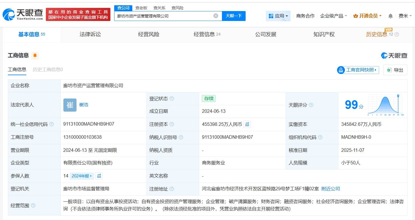 | 育公司 音老板 音关系 音风险 都在用的商业查询工具 | | | | | --- | --- | --- | --- | | 廊坊市资产运营管理有限公司 家中小企业发展子其余旗下机构 | 8 天眼一下 | 品应用 ▼ | 商务合作 | | 基本信息 55 法律诉讼 经营风险 | 经营信息 24 | 公司发展 | 知i | | 工商信息 ● | | | | | 工商信息 历史工商信息0 | | | | | 企业名称 廊坊市资产运营管理有限公司 | | | | | 登记状态 2 崔浩 法定代表人 猫 | 存续 | | 天眼评分 2 | | 成立日期 | 2024-06-13 | | | | 91131000MADNHB9H07 统一社会信用代码 0 注册资本 2 | 455398.25万人民币 益 | | 实缴资本 | | 工商注册号 131000000103638 纳税人识别号 2 | 91131000MADNHB9H07 | | 组织机构代码( | | 营业期限 2024-06-13 至 无固定期限 纳税人资质 | | | 核准日期 | | 企业类型 有限责任公司(国有独资) 行业 | 商务服务业 | | ...