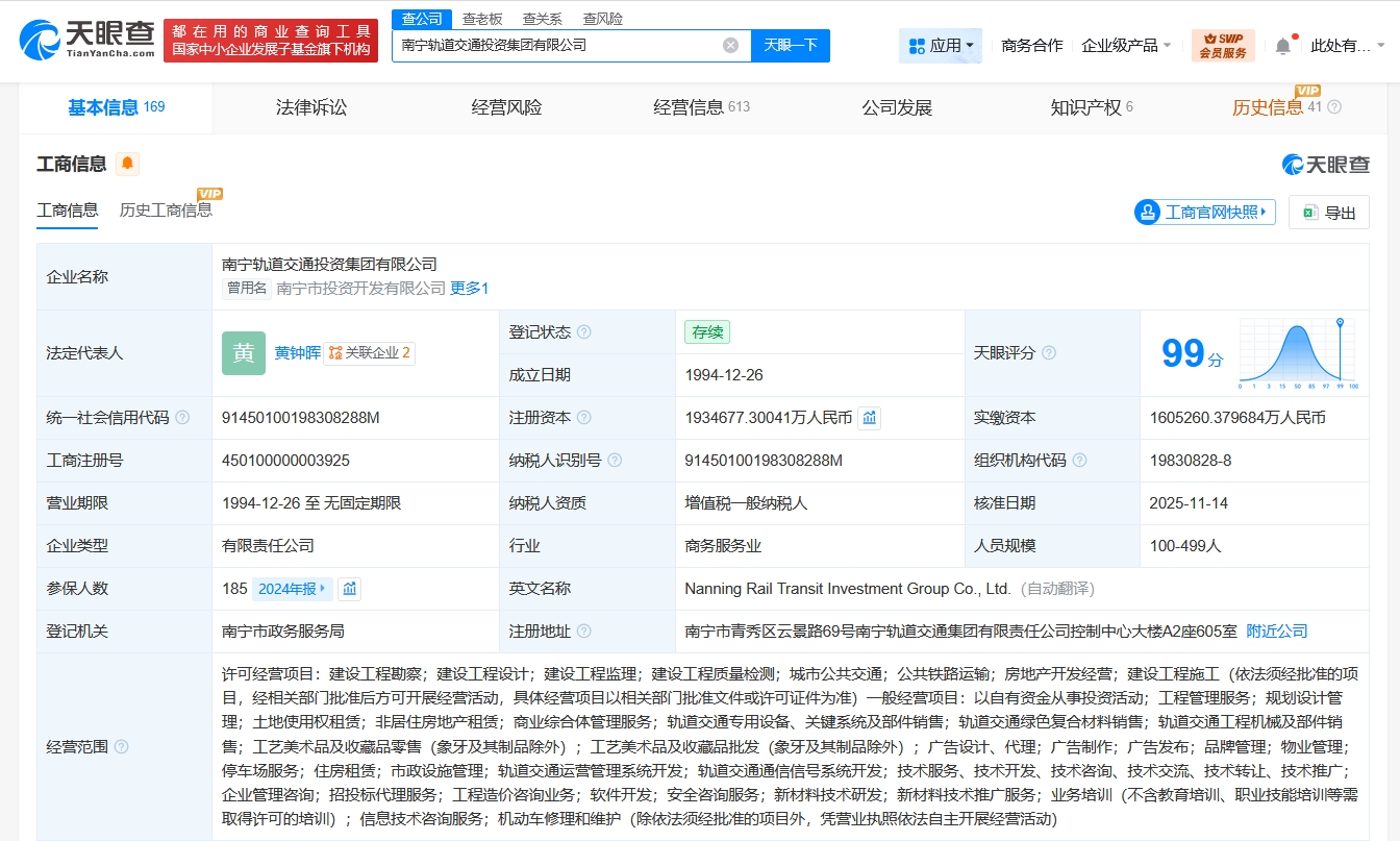 每经AI快讯,天眼查工商信息显示,近日,南宁轨道交通投资集团有限公司发生工商变更,注册资本由约184.7亿元人民币增至约193.5亿元人民币,增幅约 5%。该公司成立于1994年12月,法定代表人为黄钟晖,经营范围含建设工程勘察、建设工程设计、城市公共交通、公共铁路运输、房地产开发经营、建设 工程施工、以自有资金从事投资活动、工程管理服务等。股东信息显示,该公司由南宁市人民政府国有资产监督管理委员会全资持股。 | | 都在用的商业查询 具 | 母公司 查老板 查关系 | 管风险 | | | | | --- | --- | --- | --- | --- | --- | --- | | | 家中小企业发展子星会旗下机构 | 南宁轨道交通投资集团有限公司 | | × 天眼一下 | ▲出版社 | 商务合作 企业级产 | | 基本信息 169 | 法律诉讼 | | 经营风险 | 经营信息 613 公司发展 | | 知识产权 6 | | 工商信息 ● | | | | | | | | 历史工商信息 工商信息 | | | | | | | | 企业名称 | 南宁轨道交通投资集团有限公司 | | | | | | | | 曾用名 ...