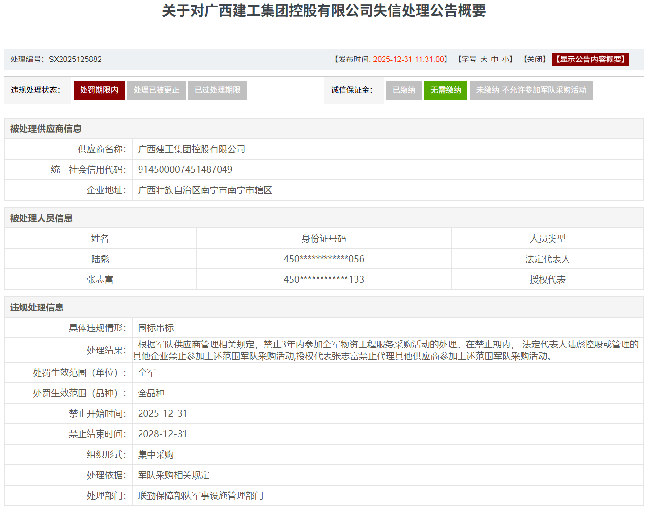 近日,军队采购网信息显示,广西建工集团控股有限公司因围标串标。被联勤保障部队军事设施管理部门根据军队供应商管理相关规定,禁止其3年内参加 全军物资工程服务采购活动的处理。在禁止期内,法定代表人陆彪控股或管理的其他企业禁止参加上述范围军队采购活动,授权代表张志富禁止代理其他供 应商参加上述范围军队采购活动。处罚生效范围为全军、全品种。 | 具体违规情形: | 围标串标 | | --- | --- | | 外理结果: | 根据军队供应商管理相关规定,禁止3年内参加全军物资工程服务采购活动的处理。在禁止期内,法法 真他企业禁止参加上述范围军队采购活动,授权代表张志富禁止代理其他供应商参加上述范围军队采购活 | | 处罚生效范围(单位): | 全军 | | 处罚生效范围(品种): | 全品种 | | 禁止开始时间: | 2025-12-31 | | 禁止结束时间: | 2028-12-31 | | 组织形式: | 集中采购 | | 处理依据: | 军队采购相关规定 | | 处理部门: | 联勤保障部队军事设施管理部门 | | 被处理供应商信息 | | | --- | --- | | 供应商名称: | 广西建工集团控股 ...