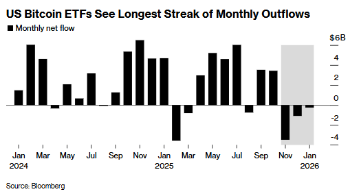 FxPro首席市场分析师Alex Kuptsikevich表示:"加密货币如今已不再被视作法定货币的替代选择,也无 法对冲主要经济体不够稳健的财政政策风险。" 周五亚洲早盘交易时段,比特币一度跌至两个月以来的最低点。当前这一全球最大加密货币的市场情绪 持续低迷,投资者也纷纷从其交易所交易基金(ETF)中撤资。 周五,比特币价格一度大跌3.9%,触及81102美元,创11月21日以来新低,延续了隔夜加速下跌的走 势。目前其价格较去年10月6日创下的历史高点已回落超34%。据CoinGlass数据显示,过去24小时内, 全市场加密货币的多头头寸爆仓金额累计超15亿美元。 美国上市的12只比特币现货ETF已连续三个月出现资金净流出,若这一趋势持续至1月末,将创下这类 产品2024年推出以来,资金持续外流的最长周期。汇编数据显示,在此期间,这类基金的资金流出规模 累计约48亿美元。 比特币的颓势与近期黄金等贵金属的大涨形成鲜明对比:面对地缘政治的不确定性,避险资金纷纷远离 加密货币,转而涌入传统避险资产,这也让比特币被称作"数字黄金"的说法备受质疑。 在部分交易员看来,比特币此次下跌还只是开端,若看空情绪持续至周末, ...