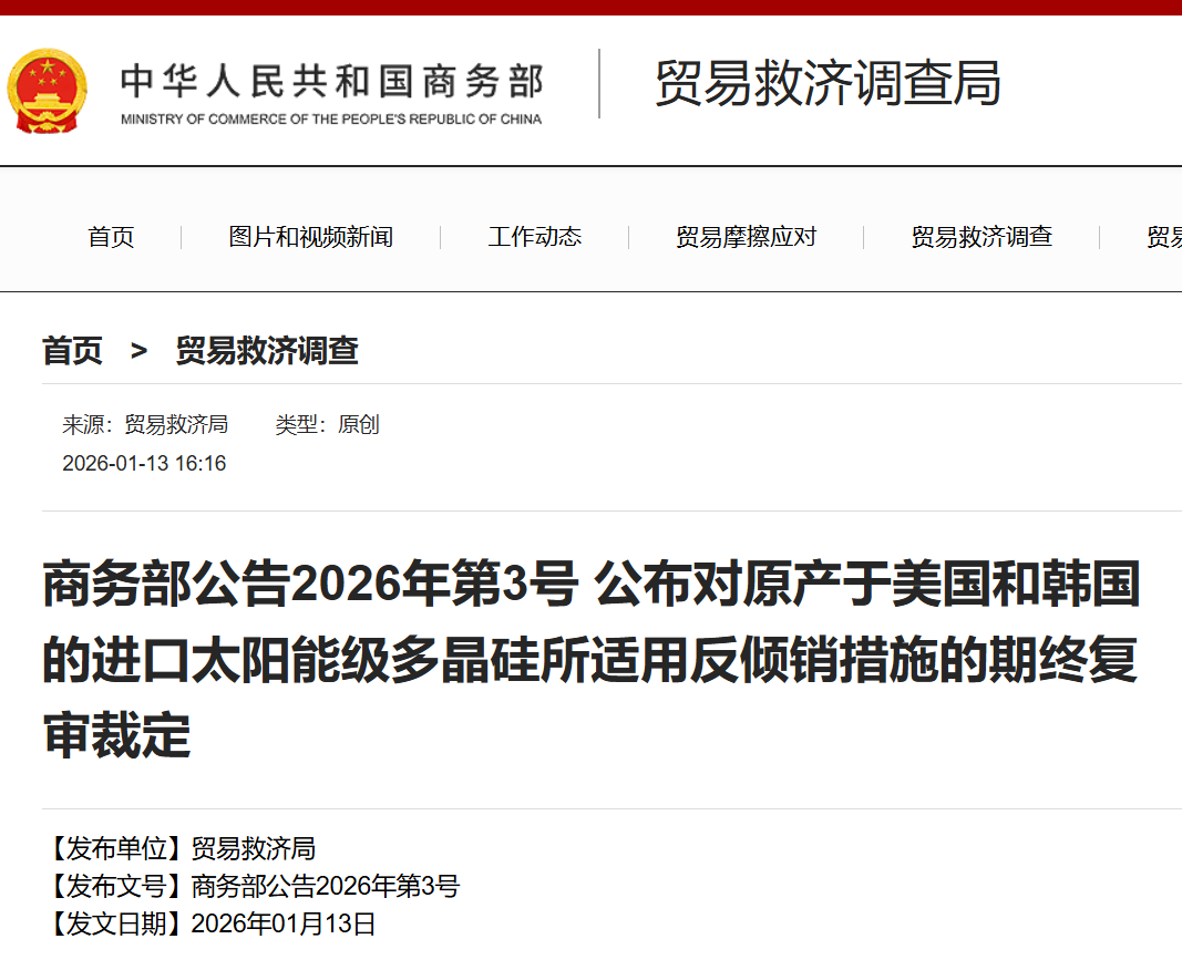 商务部发布公告2026年第3号,公布对原产于美国和韩国的进口太阳能级多晶硅所适用反倾销措施的期终复审裁定:自2026年1月14日起,对原产于 美国和韩国的进口太阳能级多晶硅继续征收反倾销税,实施期限为5年。 ...