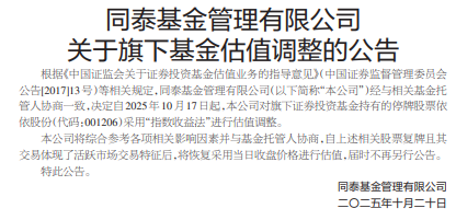 Core Viewpoint - Tongtai Fund Management Co., Ltd. announced a valuation adjustment for its funds, specifically regarding the suspended stock Yiyi Co., Ltd. (code: 001206), effective from October 17, 2025, using the "index yield method" for valuation [1] Group 1 - The decision to adjust the valuation method was made in agreement with the relevant fund custodian [1] - The company will consider various influencing factors and consult with the fund custodian before reverting to the closing price valuation method once the stock resumes trading and exhibits active market trading characteristics [1] - No further announcements will be made once the stock resumes trading and the valuation method is adjusted back to the closing price [1]
