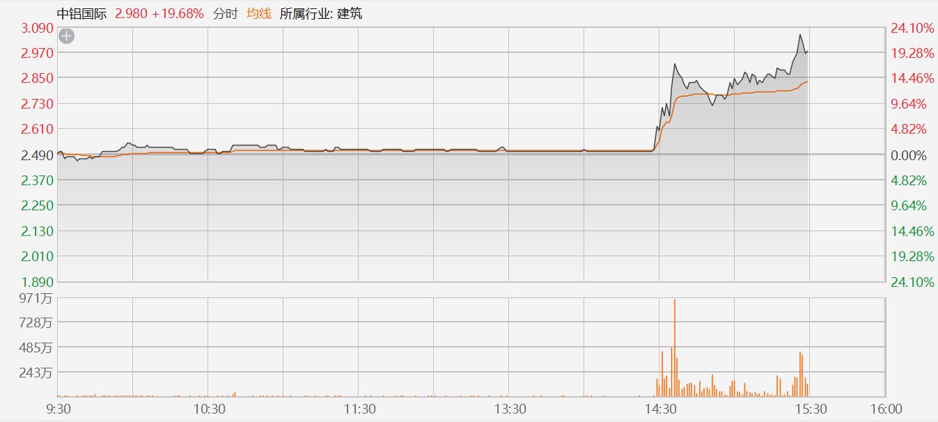 格隆汇10月22日|中铝国际(2068.HK)午后持续拉升一度涨超24%。消息面上,有媒体称,力拓考虑与中铝集团进行资产换股权交易。中铝国际A股尾盘拉升 封涨停板。 | | 中铝国际 2.980 + 19.68% 分时 均线 所属行业: 建筑 | | | | | | | --- | --- | --- | --- | --- | --- | --- | | 3.090 @ | | | | | | | | 2.970 | | | | | | | | 2.850 | | | | | | 3 | | 2.730 | | | | | | | | 2.610 | | | | | | | | 2.490 | | | | | | | | 2.370 | | | | | | | | 2.250 | | | | | | | | 2.130 | | | | | | | | 2.010 | | | | | | | | 1.890 | | | | | | | | 971万 | | | | | | | | 728万 | | | | | | | | 485万 | | | | | | | | 243万 | | | | | | | | 9: ...
