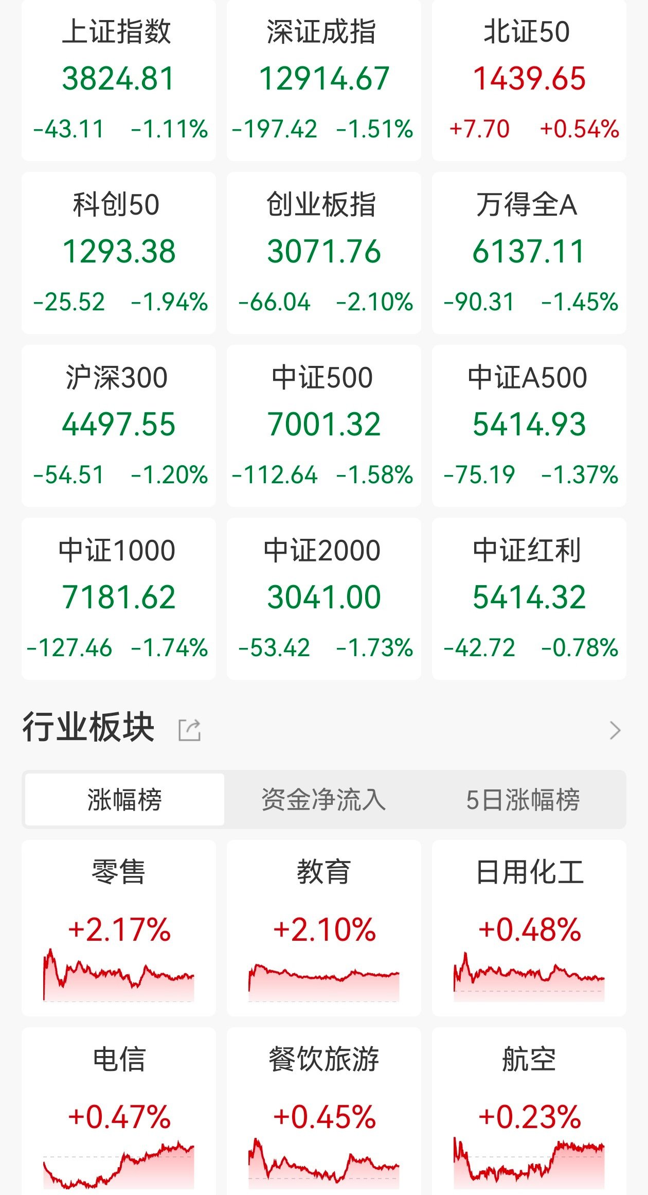 盘面上,超导概念下挫,精达股份跌停;贵金属板块走低,晓程科技、西部黄金领跌;海南板块大跌,新大洲A跌逾9%;可控核聚变板块重挫,国机重装 跌停;风电设备板块走弱,飞沃科技跌逾8%;培育钻石、船舶制造、盲盒经济及影视概念等跌幅居前。另外,退税商店、商业百货板块逆市走高,百大集 团、广百股份涨停;教育板块走高,中公教育涨停;数字货币概念股拉升,恒宝股份涨停;首批L3级自动驾驶车型获准入许可,部分自动驾驶概念股走 高,万集科技等多股涨停;免税概念、胎压监测及旅游酒店等板块涨幅居前。(格隆汇) A股三大指数今日集体下挫,截至收盘,沪指跌1.11%报3824点,深证成指跌1.51%,创业板指跌2.1%,北证50指数逆市涨0.54%。全市场成交额1.75万亿 元,较前一交易日缩量463亿元,超4300股下跌。 涨幅榜 资金净流入 5日涨幅* 教育 零售 日用化: +2.17% +2.10% +0.489 电信 餐饮旅游 航空 +0.45% +0.47% +0.239 | 上证指数 | 深证成指 | 北证5( | | --- | --- | --- | | 3824.81 | 12914.67 | 1439.6 | | - ...