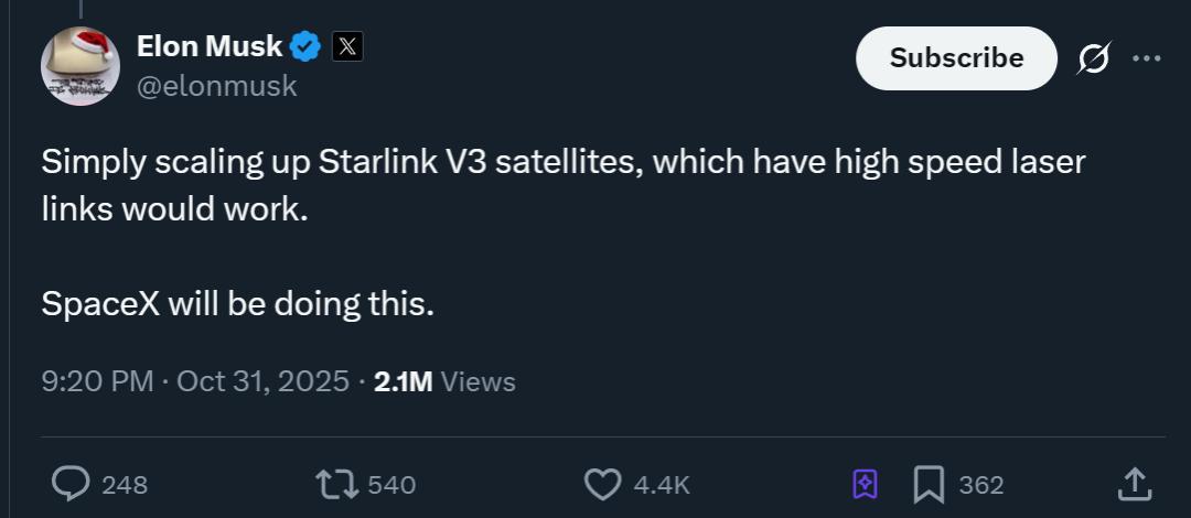 太空,成为了AI基建新的必争之地。 最近一段时间,无论是在硅谷还是国内,太空数据中心都是热议的焦点之一。 而马斯克,更是凭一己之力扛起宣传大旗,—连几条推文无不与此相关。 先是确认SpaceX未来将在太空部署数据中心: 后又在谷歌宣布太空数据中心计划时留下"Interesting"这样的评论,明确肯定了谷歌的眼光。 同时在接受公开采访时表示: 地球只接收到太阳能量的20亿分之一,如果想要产生相比地球来说多几个数量级的能量,你必须进入太空。 未来4~5年内,在太空部署和运行大规模AI系统的成本可能比在地球上运行同类系统更具成本效益。 …… 是否在同一个群我们不知道,但如果真有的话,群主一定非马斯克莫属(doge)。 如开头所提,其相关言论最近可以追溯到SpaceX这家公司身上。 人们推测,这家可能明年就要进行IPO的公司炒作"太空数据中心"概念,正是马斯克造势的手段。 就像打造"特斯拉和Optimus"这对搭档一样,马斯克曾通过不断炒作Optimus人形机器人等项目来让特斯拉搭上投资者最热衷的AI叙事快车。 按下是否是炒作不表,我们来看马斯克要在太空建立数据中心的具体逻辑。 马斯克的判断,其实并不复杂,甚至可以 ...