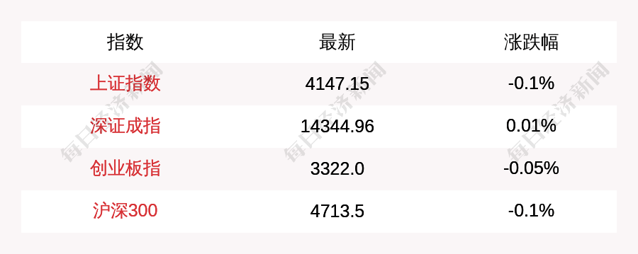 免责声明:本文内容与数据仅供参考,不构成投资建议,使用前请核实。据此操作,风险自担。 每日经济新闻 | 指数 | 最新 | 涨跌幅 | | --- | --- | --- | | 上证指数 | 4147.15 | -0.1% | | 深证成指 | 14344.96 | 0.01% | | 创业板指 | 3322.0 | -0.05% | | 沪深300 | 4713.5 | -0.1% | (记者 王晓波) 每经AI快讯:北京时间1月29日11:30,上证指数早盘下跌4.09点,跌幅为0.1%,报收4147.15点,成交额9042.04亿元;深证成指 上涨2.07点,涨幅为0.01%,报收14344.96点,成交额11123.38亿元;创业板指下跌1.56点,跌幅为0.05%,报收3322.0点,成交 额5125.3亿元;沪深300下跌4.49点,跌幅为0.1%,报收4713.5点,成交额5316.3亿元。 涨幅前五的行业分别是贵金属7.29%、文化传媒4.19%、采掘行业3.23%、房地产服务2.92%、房地产开发2.15%。 跌幅居前的行业分别是电子化学品-1.69%、电源设备-1.28%、电网设备-1. ...