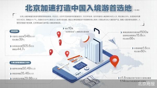 随着入境旅游市场持续升温,2025年北京文旅发展迎来新一轮跃升。1月20日,北京市文旅局发布的数 据显示,2025年北京共接待入境游客548万人次,并实现旅游花费505.6亿元,两项数据均再创历史新 高。在亮眼数据的背后,北京围绕入境便利服务与多元产品体系同步发力——首都、大兴两大机场"北 京服务"站点已累计服务旅客超147万人次;旅游线路设计与客源需求深度对接,逐步构建覆盖多群体、 多场景的产品矩阵。随着入境游客快速增长、入境利好措施不断完善,北京正加速向中国入境旅游首选 地迈进。 入境游客同比增长39% 北京市文旅局发布的数据显示,2025年全年,全市共接待入境游客548万人次,同比增长39%;实现旅 游花费505.6亿元,增幅达44.7%,两项数据均再创历史新高,为国际交往中心建设注入澎湃文旅动能。 从客源结构来看,根据北京市文旅局公布的数据,2025年北京入境主要客源国前三名为俄罗斯、美国、 马来西亚,游客量分别为50.49万人次、35.46万人次、29.88万人次。 拿着单反相机拍摄祈年殿、在前门大街与伙伴们吃羊肉串、到北京环球度假区乘坐游乐设施……如今, 在北京的大街小巷里都能看到入境游客的身影。 ...