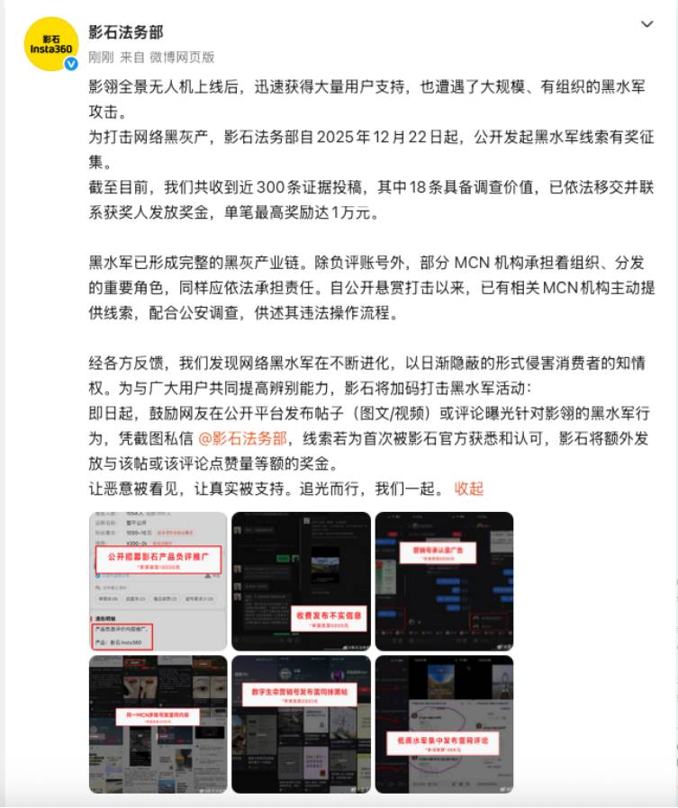 影石创新重拳打击黑水军,首批悬赏奖励正式发放,单笔最高一万元,高管出资10万元发黄金。 1月27日,影石创新(Insta360)在其法务部微博发布声明,公布"打击黑公关"线索征集阶段性成果。此前影石发起黑公关 线索征集,在过去一个月内,共收到近300条证据投稿,其中18条符合奖励标准,单笔最高奖励达1万元。 此外,影石中国区负责人袁跃宣布个人出资10万元,打造专属黄金纪念品,奖励目前最具价值的线索提供者。奖品创意别 致,"金马奖"寓意马年送金马,"黄金拖鞋"象征用拖鞋直面"小强","黄金鞭"与"黄金哨"也引发网友讨论。 声明揭露,针对其新款无人机"影翎A1"的黑水军行为已形成产业链,包括公开招募发布负面内容、营销号有偿诋毁、 MCN机构组织多账号发布雷同信息等。影石表示,自公开悬赏打击以来,已有相关MCN机构主动提供线索,配合公安调 查,供述其违法操作流程。 为持续净化网络环境,影石宣布升级线索征集活动:即日起,鼓励用户在公开平台发布帖子(图文/视频)或评论曝光针 对"影翎"的黑水军行为,凭截图私信官方。若线索属首次被影石采纳,将额外发放与该帖或该评论点赞数等额的奖金。 2025年12月,影石首款全景无人机" ...