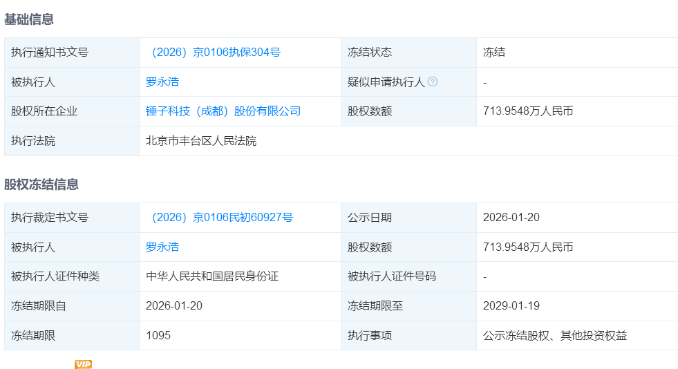 凤凰网财经讯 1月22日 天眼查天眼风险信息显示, 罗永浩名下新增一则股权冻结记录,其持有的锤子科技(成都)股份有限公司约714万元股权被司法冻结, 冻结期限自2026年1月20日起至2029年1月19日止,执行法院为北京市丰台区人民法院。 | 序号 | 执行通知书文号 | 被执行人 | 股权所在企业 | 股权数额 | 执行法院 | 类型 | 状态 | 源 | | --- | --- | --- | --- | --- | --- | --- | --- | --- | | 1 | (2026) 京0106执保3 | 罗永浩 | 锤子科技(成都) 股 | 713.9548万人民 | 北京市丰台区人 | 股权冻结 | 冻结 | 202 | | | 04号 | | 份有限公司 | e | 民法院 | | | 202 | | 2 | (2023) 京01财保258 | 罗永浩 | 成都锤子科技集团有 | 713.9535万人民 | 北京市第一中级 | 股权冻结 | 冻结 | 202 | | | 를 | | 限公司 | モ | 人民法院 | | | 202 | | 3 | (2023) 京01财保258 | 罗永浩 ...