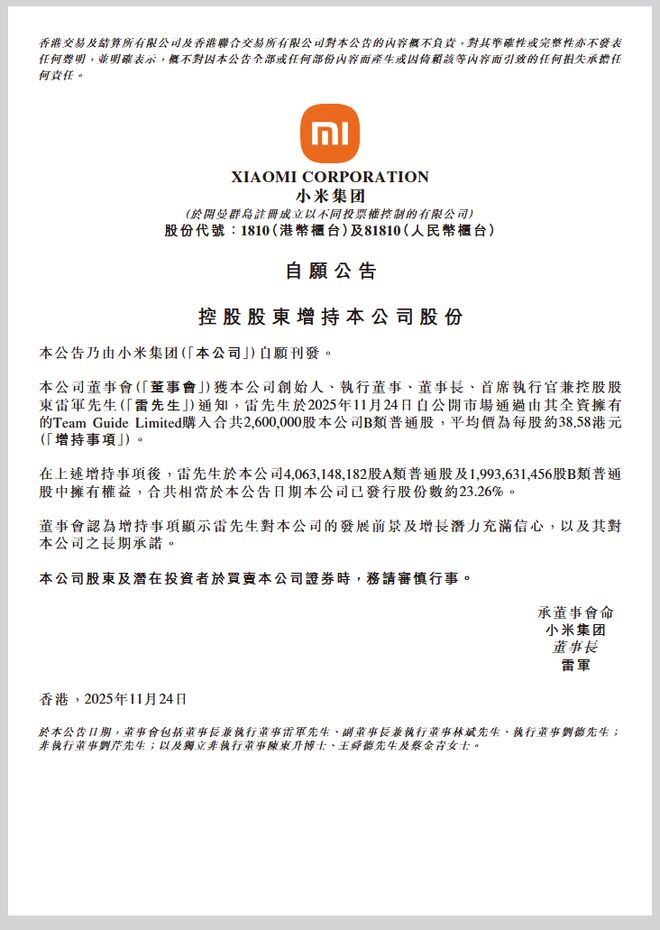 Core Viewpoint - Xiaomi Group's founder and CEO Lei Jun has purchased 2.6 million Class B shares at an average price of approximately HKD 38.58 per share, demonstrating confidence in the company's growth potential and long-term commitment [1][4]. Shareholding Increase - Lei Jun's acquisition involved an investment exceeding HKD 100 million through his wholly-owned Team Guide Limited [1][4]. - Following this purchase, Lei Jun holds a total of 4,063,148,182 Class A shares and 1,993,631,456 Class B shares, representing approximately 23.26% of the company's total issued shares [1][4]. Financial Performance - For Q3 2025, Xiaomi reported total revenue of CNY 113.1 billion, marking a year-on-year increase of 22.3% [8]. - Adjusted net profit for the same quarter reached CNY 11.3 billion, reflecting a significant year-on-year growth of 80.9% [8]. - The company achieved over 100,000 electric vehicle deliveries in the quarter, marking its first profitable quarter in this segment [8]. - Revenue from innovative businesses, including smart electric vehicles and AI, surged to CNY 29 billion, a year-on-year increase of over 199% [8]. - Xiaomi's smartphone revenue was CNY 46 billion, with a shipment of 43.3 million units, continuing a nine-quarter streak of year-on-year growth [8].