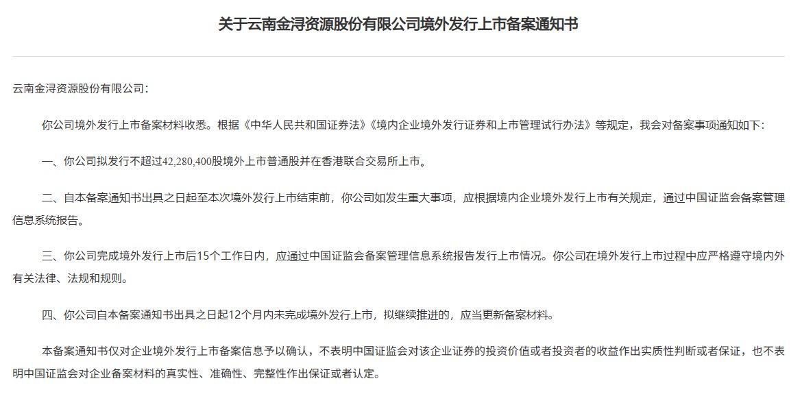 11月28日,中国证监会国际合作司发布《关于云南金浔资源股份有限公司境外发行上市备案通知书》。金浔股份拟发行不超过42,280,400股境外上市普通股 并在香港联合交易所上市。 招股书显示,金浔股份是优质阴极铜的领先制造商,根据弗若斯特沙利文的资料,截至2024年12月31日,按在刚果(金)及赞比亚的产量计, 公司在中国阴极 铜生产商中排名第五,并为两个司法权区中唯一排名前五大的中国公 司。具体而言,公司于2024年在刚果(金)及赞比亚分别生产约16,000吨及5,000吨阴极 铜。在中国的民营企业中,按2024年的产量计,公司于刚果(金)排名第三,并于赞比亚排名第一。 ...