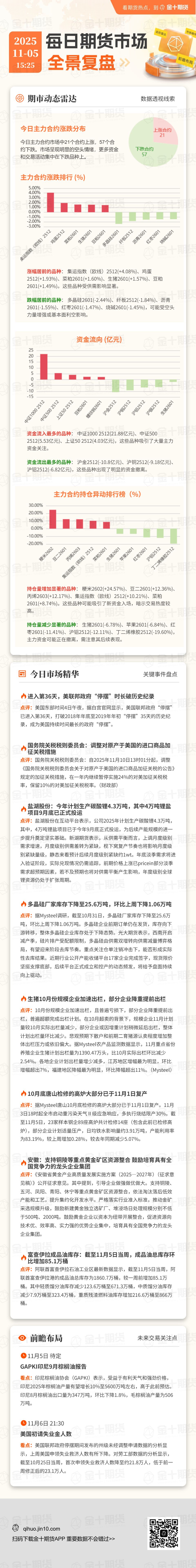 看期货热点,到 3 金十期货 EH 2025 11-05 15:25 6 期市动态雷达 今日主力合约涨跌分布 今日主力合约市场中21个合约上涨,57个合 约下跌。市场呈现明显的空头情绪,更多资金 和交易活动集中在下跌品种上。 主力合约涨跌排行 (%) 涨幅居前的品种: 集运指数(欧线)2512(+4.08%)、鸡蛋 2512(+1.93%)、菜粕2601(+1.60%)、生猪2601(+1.57%)、豆粕 数据透视线索 2601(+1.49%)。这些品种受供需影响显著。 跌幅居前的品种: 多晶硅2601(-2.44%)、纤板2512(-1.84%)、沥青 2601(-1.55%)、红枣2601(-1.47%)、烧碱2601(-1.45%),可能受空头 力量增强或基本面利空影响。 6 - 200 (7 T 20 15 10 -15 资金流入最多的品种: 中证1000 2512(21.88亿元)、中证500 2512(5.53亿元)、上证50 2512(4.03亿元),这些品种吸引了大量主力 资金关注。 资金流出最多的品种: 沪金2512(-10.8亿元)、沪铜2512(-9.18亿元)、 沪铝2512(-6.8 ...