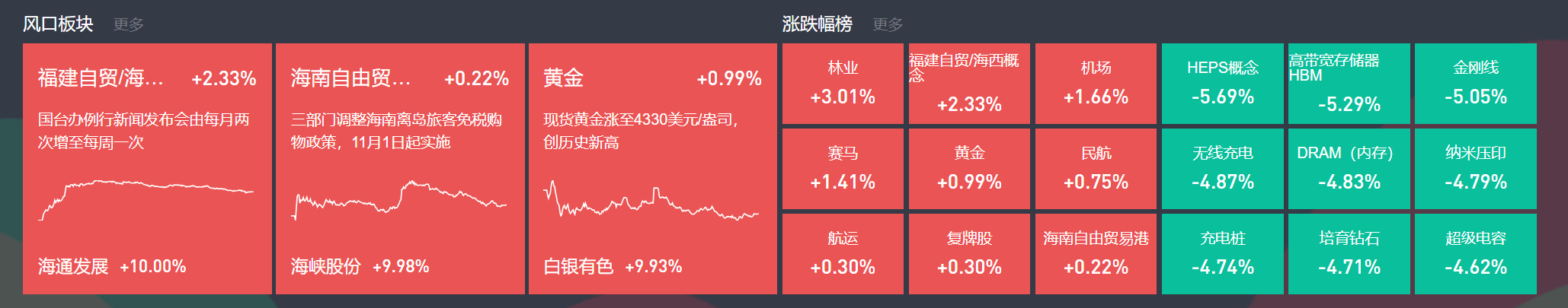 Market Overview - The market experienced a decline, with the Shenzhen Composite Index and ChiNext Index both dropping over 3%. Local stocks in Fujian showed resilience, with Pingtan Development hitting the daily limit. The Hainan Free Trade Port concept gained traction, with Haixia Co. also reaching the limit. Gold stocks continued to perform strongly, while several heavyweight stocks weakened, including a 10% drop in Sungrow Power Supply and a limit down for ZTE Corporation. Overall, nearly 4,800 stocks in the Shanghai and Shenzhen markets were in the red, with a total trading volume of 1.95 trillion yuan [1]. Hot Topics Fujian Free Trade Zone - The Fujian Free Trade Zone sector saw gains, with Haitong Development achieving two consecutive limit-ups, and Pingtan Development and Haixia Innovation also hitting the limit [3][4]. Hainan Free Trade Port - The Hainan Free Trade Port remained active, with Haixia Co. achieving two consecutive limit-ups and Hainan Airport rising by 6%. A new announcement from the Ministry of Finance, General Administration of Customs, and State Taxation Administration regarding the adjustment of duty-free shopping policies for travelers in Hainan will take effect on November 1. The official closure of the Hainan Free Trade Port is set for December 18, 2025, with less than 100 days remaining until its operation begins [5][6]. Gold Sector - The gold sector showed renewed strength, with silver and non-ferrous metals stocks also hitting the limit. The current gold price reached 4,330 USD per ounce, and historical data suggests that gold stocks often exhibit significant elasticity following an upward trend in gold prices [8][9].