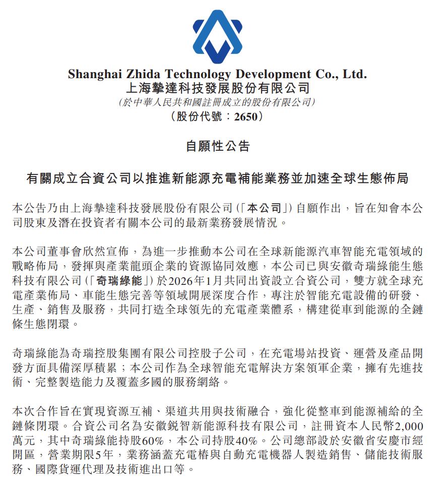 1月29日,港股上市公司挚达科技(02650)与奇瑞集团控股旗下安徽奇瑞绿能生态科技有限公司("奇瑞绿能")签署一揽子合作协议,宣布 共同出资设立合资公司。这并非一份寻常的战略合作备忘录,而是一份细节严苛、深度捆绑、意图深远的"联姻契约"。 在安庆经开区一片已挂牌"挚达"标识的现代化厂房里,一批崭新的充电桩正从生产线下线,准备发往海外。不久之后,它们的铭牌可能会悄 然更换,增加一个新的合作方。 根据公告,挚达科技不仅以40%的占股成为"小股东",奇瑞绿能认缴1200万元占股60%,彰显了双方"风险共担、利益共享"的深度协同逻辑, 目的是共同打造覆盖智能充电设备研发、生产、销售及全球服务的全链条生态,核心聚焦自动充电机器人、AI在智能充电技术上的应用、智 能充电技术的规模化落地等。 在资本市场仍在对挚达此前斩获卡塔尔政府订单津津乐道时,这家充电桩领军企业已悄然下出一步更为大胆的棋。这步棋,看似是"以技术换 市场",实则是在新能源补能战争进入下半场时,为锁定一个确定性未来而进行的战略豪赌。 双轮驱动的"轻资产"出海新模式 作为全球智能充电与绿色数字能源领域的领军者,挚达科技在自动充电机器人、光储充一体化系统、高功 ...