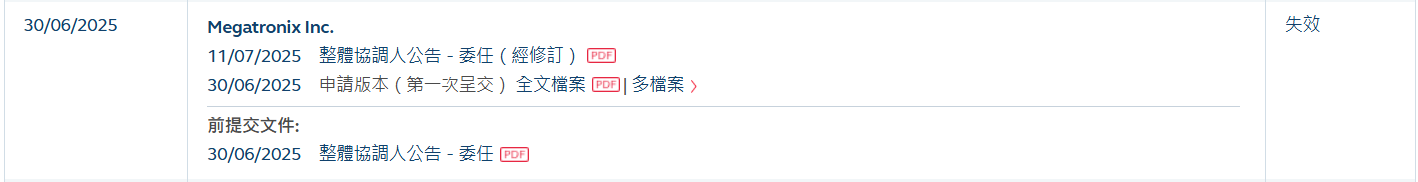 招股书显示,镁佳股份是一家创新驱动的领先汽车科技公司,致力于重塑未来出行。公司专注于研发并交付以人工智能(AI)为核心的集成式域控解决方案, 助力主机厂打造下一代软件定义汽车。 尽管镁佳股份目前聚焦于汽车领域,但该公司所构建的技术和能力,包括模块化软件架构、智能功能与硬件的无缝融合等,不仅是对传统汽车的渐进式升 级,更是在为明日智能出行乃至更广阔未来打下基础。 镁佳股份有限公司(简称:镁佳股份)于2025年6月30日所递交的港股招股书满6个月,于2025年12月30日失效,递表时中金公司、花旗、德意志银行为其联席 保荐人。 | 30/06/2025 | Megatronix Inc. | | --- | --- | | | 11/07/2025 整體協調人公告 - 委任(經修訂) 吧 | | | 30/06/2025 申請版本(第一次呈交) 全文檔案 [四]多檔案》 | | | 前提交文件: | | | 30/06/2025 整體協調人公告 - 委任 回 | ...