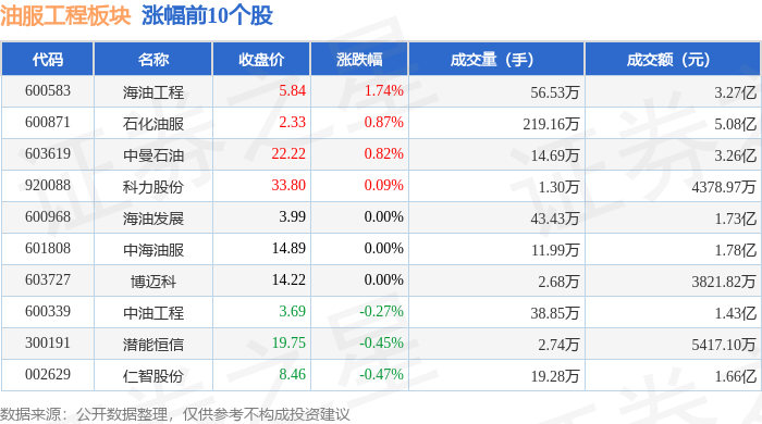Core Insights - The oil service engineering sector experienced a slight increase of 0.28% on November 10, with Haiyou Engineering leading the gains [1] - The Shanghai Composite Index closed at 4018.6, up 0.53%, while the Shenzhen Component Index closed at 13427.61, up 0.18% [1] Stock Performance - Notable gainers in the oil service engineering sector included: - Jiao Ding Si Shi (600583) with a closing price of 5.84, up 1.74% and a trading volume of 565,300 shares, totaling a transaction value of 327 million yuan [1] - PetroChina Oilfield Services (600871) closed at 2.33, up 0.87% with a trading volume of 2,191,600 shares, totaling 508 million yuan [1] - Conversely, some stocks faced declines: - Ren Zhi Co., Ltd. (002629) closed at 8.46, down 0.47% with a trading volume of 192,800 shares, totaling 166 million yuan [2] - Zhongyou Engineering (600339) closed at 3.69, down 0.27% with a trading volume of 388,500 shares, totaling 143 million yuan [2] Capital Flow - The oil service engineering sector saw a net outflow of 98.54 million yuan from institutional investors, while retail investors contributed a net inflow of 71.57 million yuan [2] - Specific stock capital flows included: - Haiyou Engineering (600583) had a net inflow of 19.61 million yuan from institutional investors, but a net outflow of 29.50 million yuan from speculative funds [3] - Ren Zhi Co., Ltd. (002629) experienced a net outflow of 7.96 million yuan from institutional investors, while speculative funds saw a net inflow of 17.30 million yuan [3]